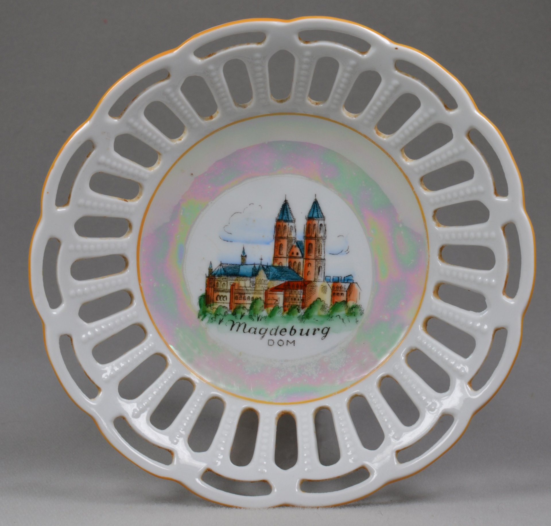 Durchbruchschale mit Perlmutt-Glasur; im Spiegel die Ansicht bezeichnet: „Magdeburg Dom“; ausgemalter Linienvordruck, Malermarke in Rot auf Glasur; H.: 3,5cm; D.: 13,5cm