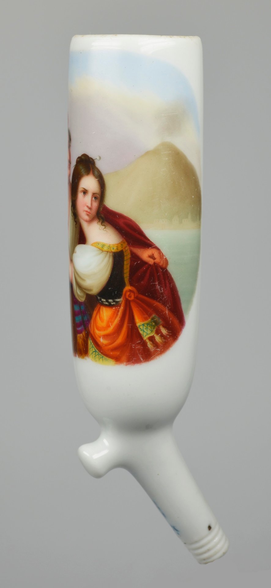 Pfeifenstummel aus Porzellan, zylindrische Form, mit bunten Muffelfarben ¾ den Korpus umfassende Porzellanmalerei, mit bunten Muffelfarben die Darstellung der Schauspieler Julius Cornet und Betty Schröder als Masaniello und Fenella in der Oper „Die Stumme von Portici“, Text nach Scribe und Musik von Daniel-François-Esprit Auber nach Malvorlage von Ludwig Julius Asher (1804-1878). Erstmals am 29. Februar 1828 in Paris aufgeführt; Ferse mit Presszahl 9; auf dem Stiel unterglasur blau Strich über PFS; Stielboden mit unterglasurblauem halbseitigem Strich; H.: 13,5cm (b=107,3; c=33mm)