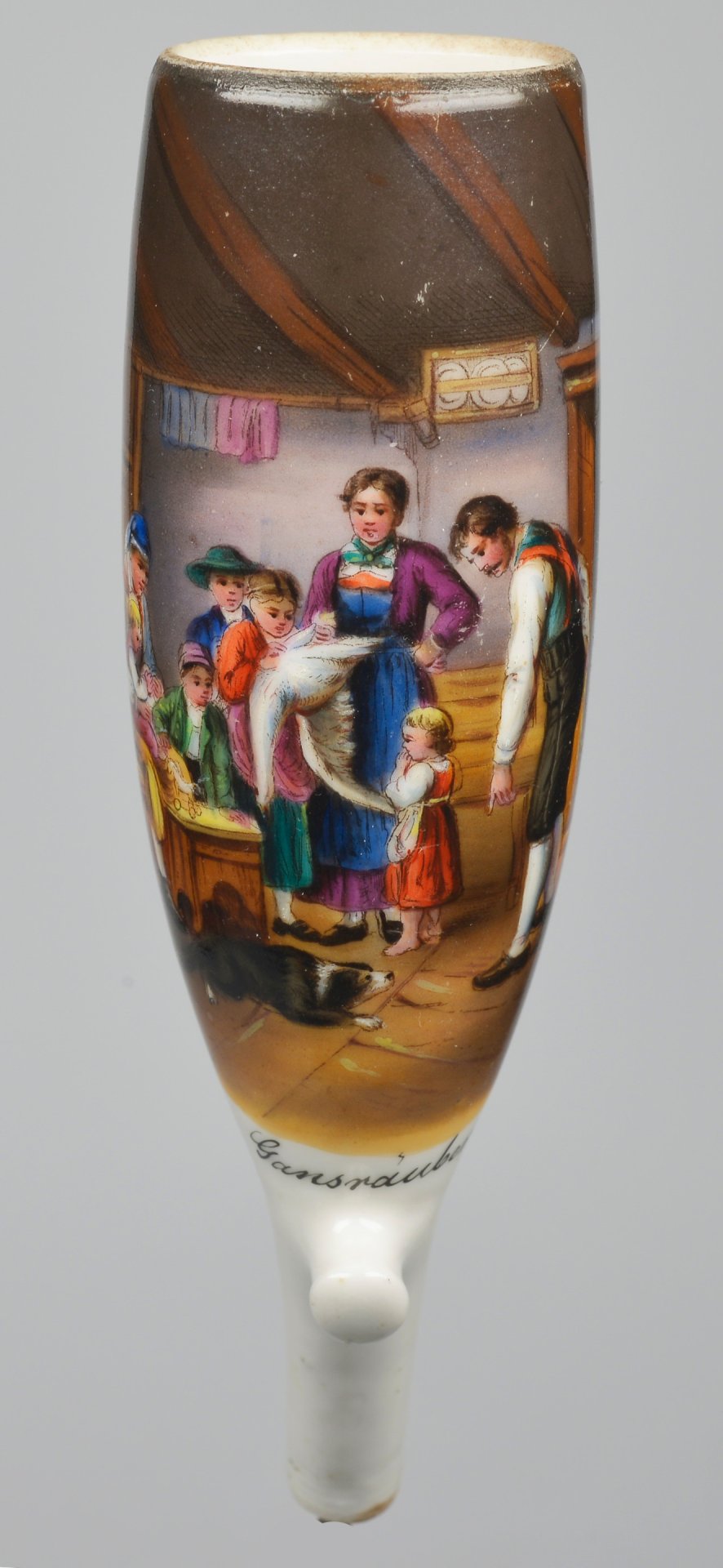 Berliner Form, den Korpus zu 2/3 umfassendes Bildfeld, darin mit bunten Muffelfarben die Darstellung des Motivs „Gansräuber“ (Holzstiches aus dem Jahr 1882). Unter der Abbildung in schwarzer Schreibschrift „Gansräuber“. H=12,9 cm (b=10,2; c=37,9mm)