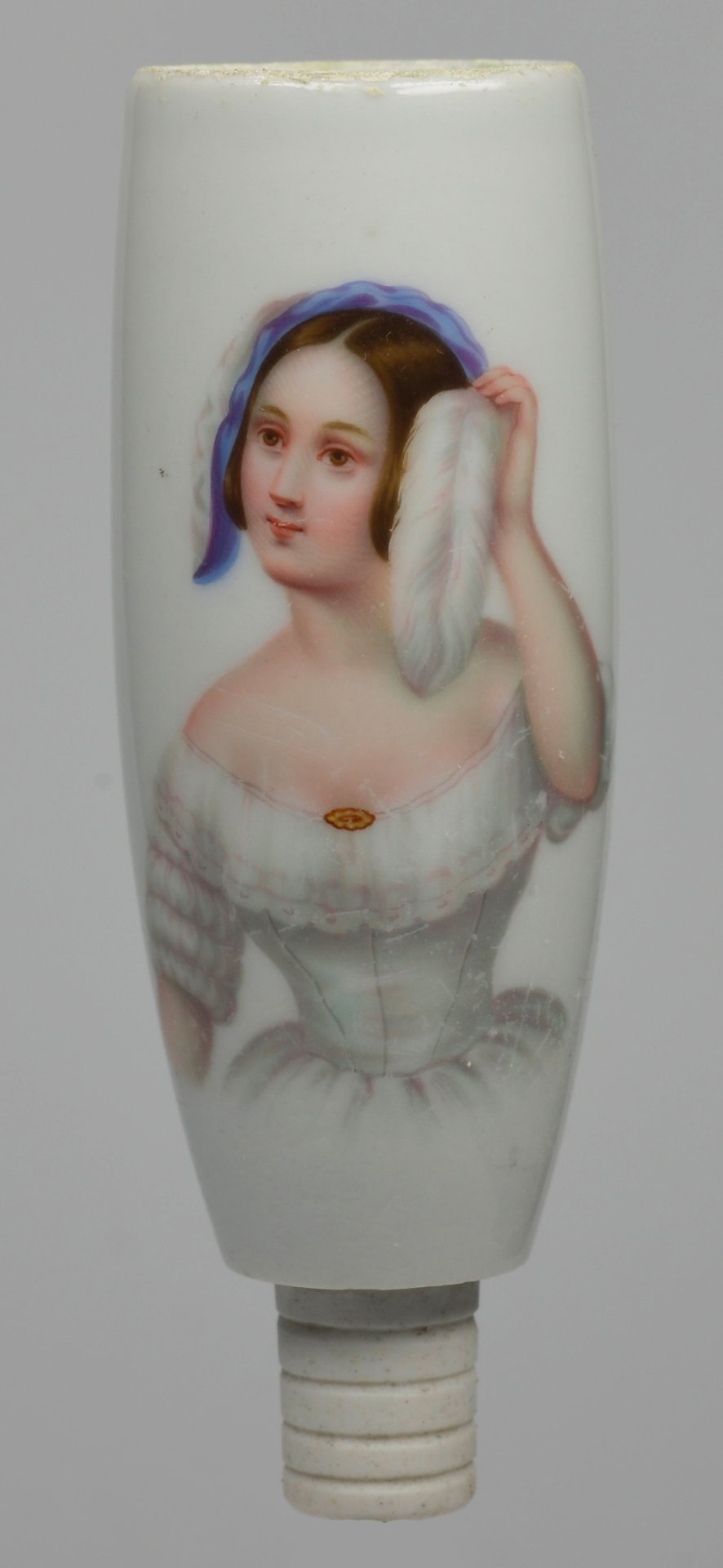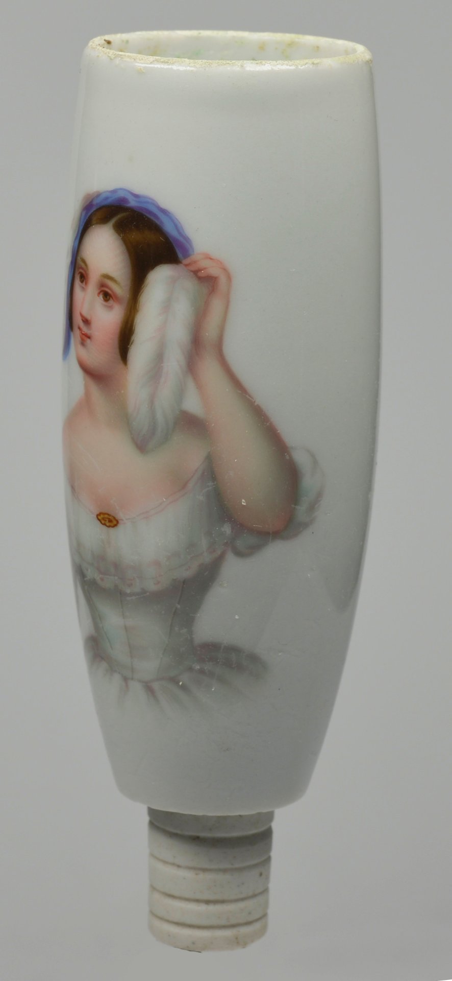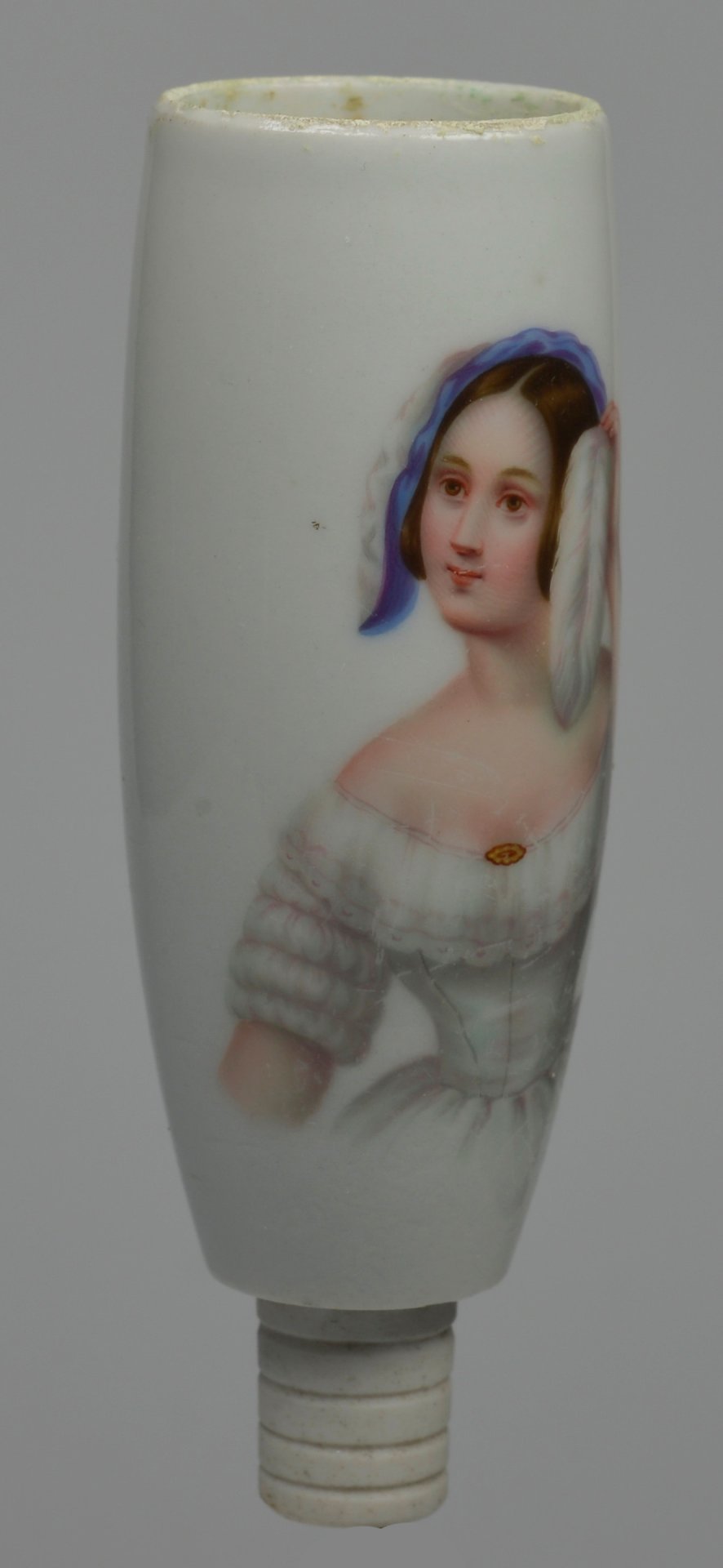 Pfeifenstummel mit Schraubstutzen aus Porzellan; auf grauem Fond in bunten Muffelfarben Dreiviertelporträt der königl. bayerischen Hofschauspielerin Konstance Dahn; vergleichbarer Pfeifenstummel ist das Portrait aus der Sammlung von Prof. Dr. Berg, hier unter der Nummer B0154 geführt; (Farben, Malweise, Brosche im Dekolleté, Gesichtsausdruck sind direkt vergleichbar); H=9,5cm (c=33,4mm)
