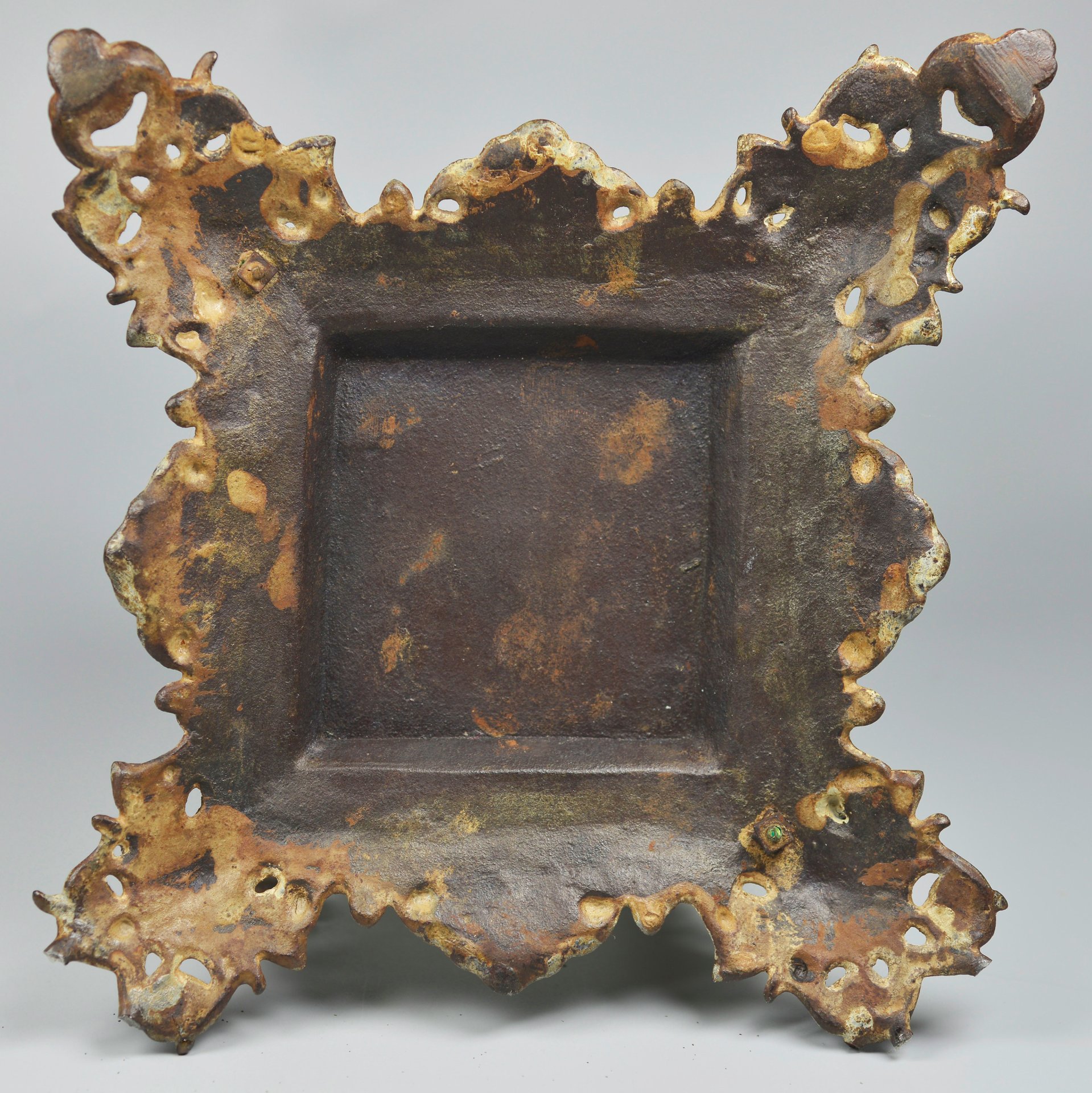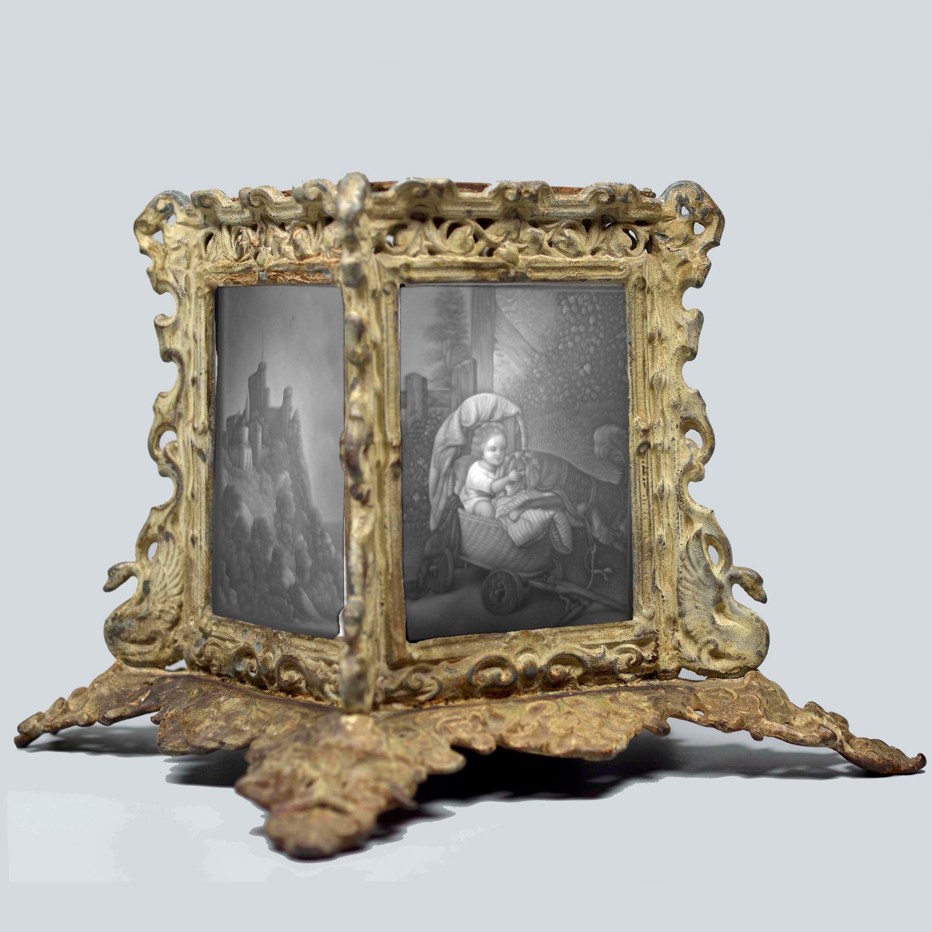 Stövchen, (Réchaud), Eisenkunstguss, auf 4 weit ausgestellten Füßen an zwei Stellen aufgeschraubter Quaderförmiger Gusskörper mit aufwendiger plastischer Ornamentik, an den 4 Seiten jeweils die Aussparungen für die Lithophanien. Als Abschluss eine reich durchbrochene Deckplatte. Der gesamte Korpus war wohl ursprünglich weiß oder chremefarbig gefasst. H=14,5 cm, Fuß: 17,5 x 17,5 cm; Quader unten: 12 x 12 cm; Quader oben: 11 x 11 cm; Deckplatte: 8,7 x 8,7 cm.