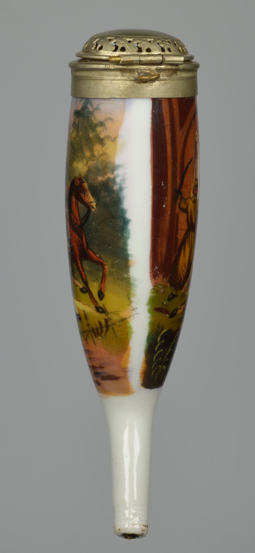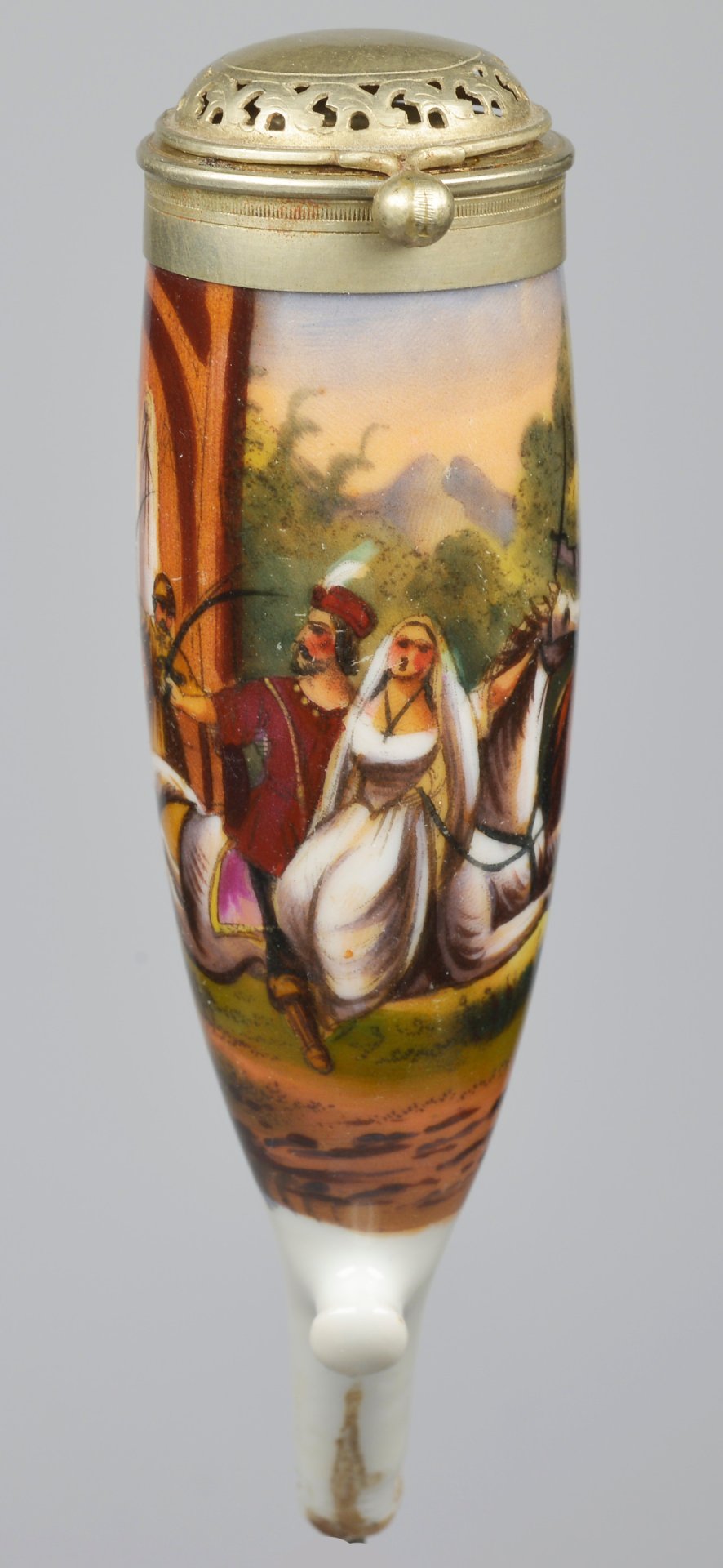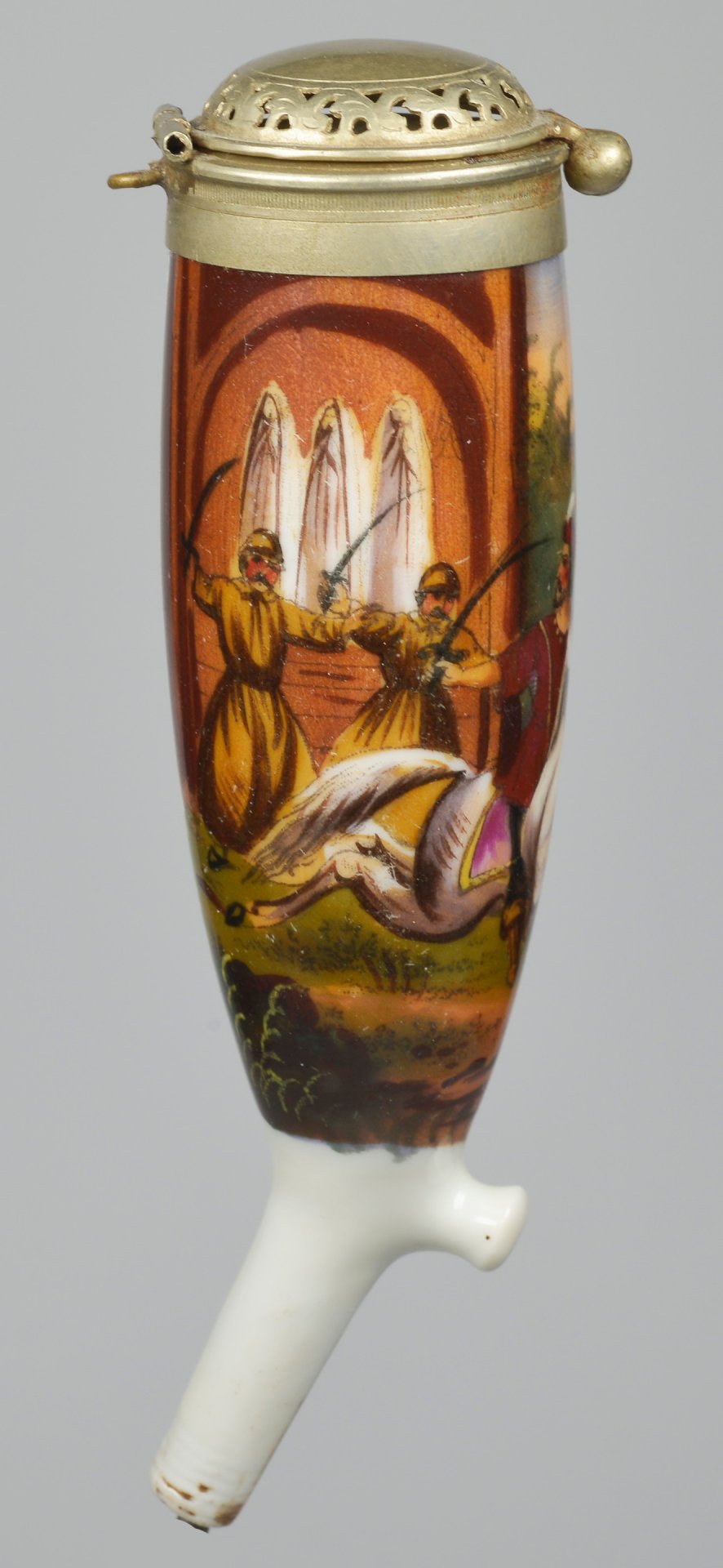 Pfeifenstummel aus Porzellan, Berliner Form; umlaufend mit bunten Muffelfarben bemalt mit einer orientalischen Szene, die eine lebendige figürliche Szene mit Reitern und Staffage in weiter Landschaft zeigt. Montur: durchbrochen gearbeitete Metall-Deckel mit Kugelverschluss