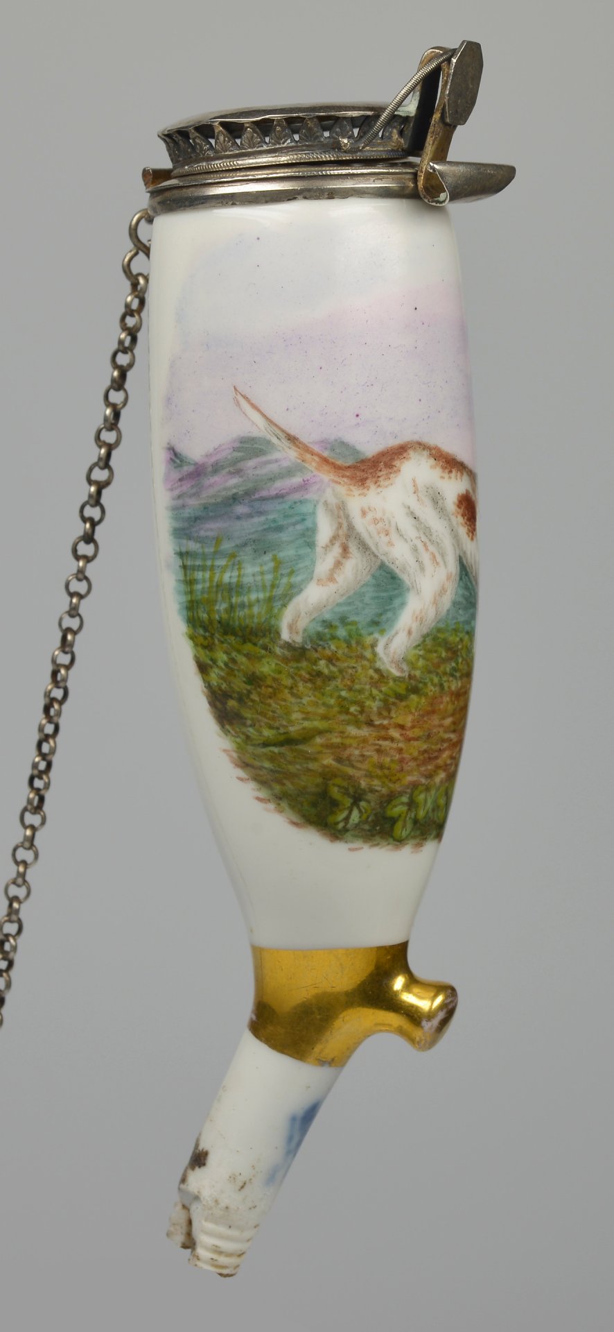 Porzellan-Pfeifenkopf, Berliner Form, zu 2/3 den Korpus umspannende ovale Kartusche, darin mit bunten Muffelfarben die Darstellung eines Jagdhundes und im Hintergrund ein Jäger mit Gewehr; Montur: Silber; Knopf umlaufend vergoldet; Stiel mit unterglasurblauer Adlermarke, darunter KPM (vergl. E. Röntgen, Deutsche Porzellanmarken, Nr. 215); aufwendig gestaltete Montur aus Silber; Deckel mit eingeprägtem Putto, der im Wind segelt; H=14,1 cm (a=127,5; b=98,1; c=36,8 mm)