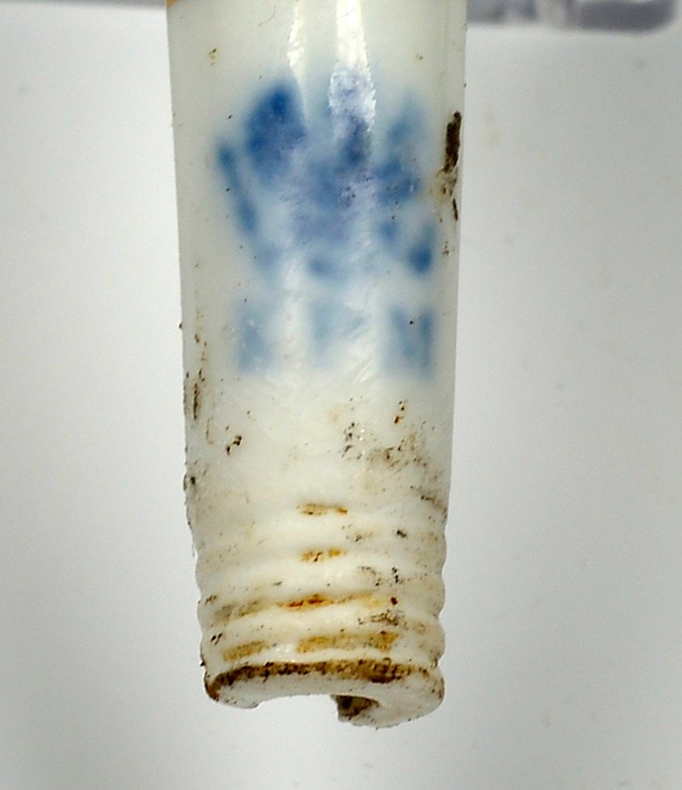 Abguss aus Porzellan: Eine silberne Perlschnur verbindet Abguss und Pfeifenkopf; Tülle zum Pfeifenkopf gepunzt und Aufnahme für Rohr aus Silber; Form Weißporzellan glasiert (vergl. Nr. 9 „Musterzeichnung von „Tabacks Agzügend der Manufaktur Berlin um 1822“, Morgenroth, Porzellanpfeifen, S. 44) H=10,6 cm