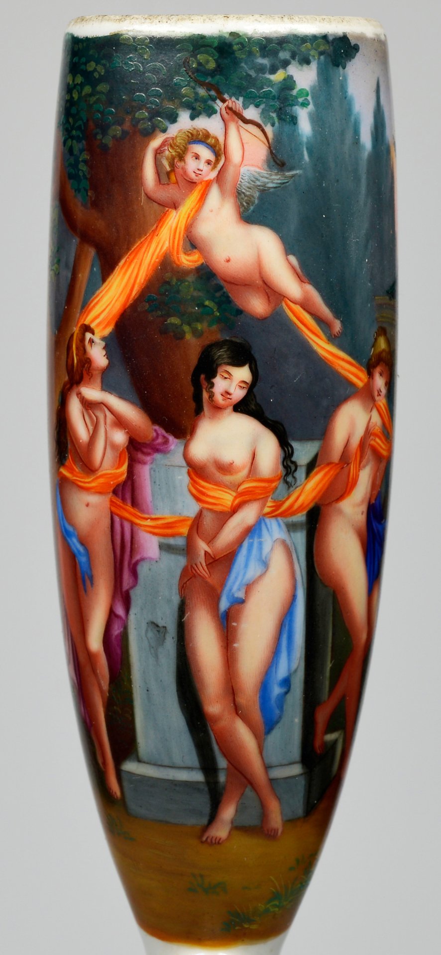Pfeifenstummel aus Porzellan, Berliner Form; auf der Wandung drei Viertel  den gesamten Korpus umspannendes Bildfeld; in bunten Muffelfarben die Darstellung von Amor mit Feil und Bogen über den drei Grazien; blauer Querstrich am Stielende, Pressmarke 10 auf Stummelferse;  H.: 15,2cm (b=115,6; c=40,8mm)