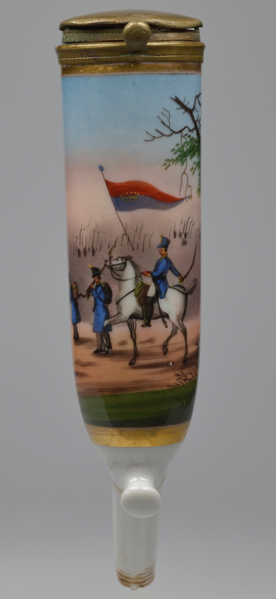 Pfeifenstummel aus Porzellan, zylindrischer Korpus;  zu 2/3 umlaufend den Korpus umspannendes, goldgerahmtes Bildfeld; darin mit bunten Muffelfarben Darstellung von 2 Soldaten in blauen Uniformen und schwarzen Tschakos und einem Offizier auf einem Schimmel reitend. Über der Szene weht eine rot-blaue Fahne mit goldener Krone und Zierpunkten, deutlicher Hinweis auf das Königreich Hannover in zeittypischer hannoverscher Kavallerie- oder Infanteriebekleidung der ersten Hälfte des 19. Jahrhunderts. Im Hintergrund mehrere aufgerichtete Gewehre, vermutlich Teil einer Paradeaufstellung; ohne Marken; Montur: Messing, H=12,8cm (a=122; b=96,1; c=28,4mm)