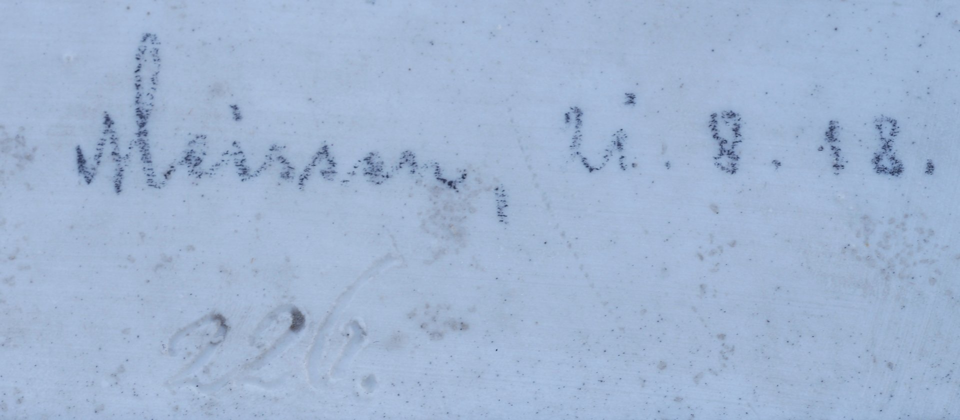 Lithophanie, außen mit einfarbigen Ornamenten und innen Oval von plastischem Perlfries umgeben, darin polychrome Porzellanmalerei mit Darstellung zweier eng aneinander geschmiegter Mädchen; Erstausformung um 1849, im Preis-Courant 1851/52 bezeichnet: „Zwei Mädchen in Roccoco Costüm“; Rückseite und Rand Vorderseite unten Mitte: Ritzmarke 226; oberhalb der Modellnummer mit Bleistift der Eintrag: Meissen 21.8.18 (wohl die Anmerkung des Vorbesitzers 1918); bleiverglaste Platte anschließend in Blechrahmen verbracht; Platte mit Blechrahmen = 25 x 19,5 cm.
