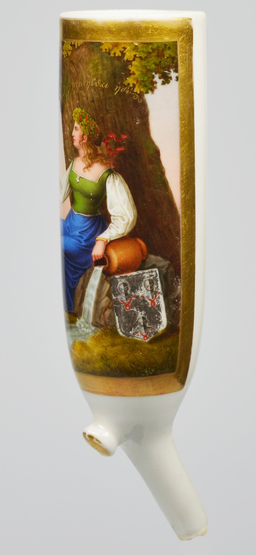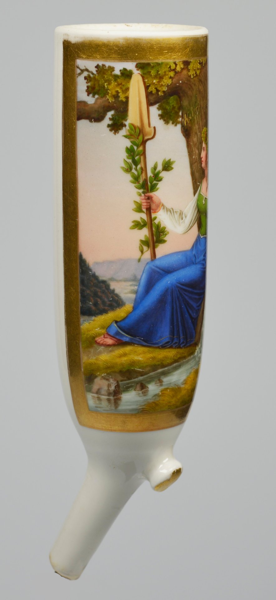 Pfeifenstummel aus Porzellan, zylindrischer Korpus, auf der Wandung 3/4 den gesamten Korpus umspannendes, golden gerahmtes Bildfeld; in bunten Muffelfarben