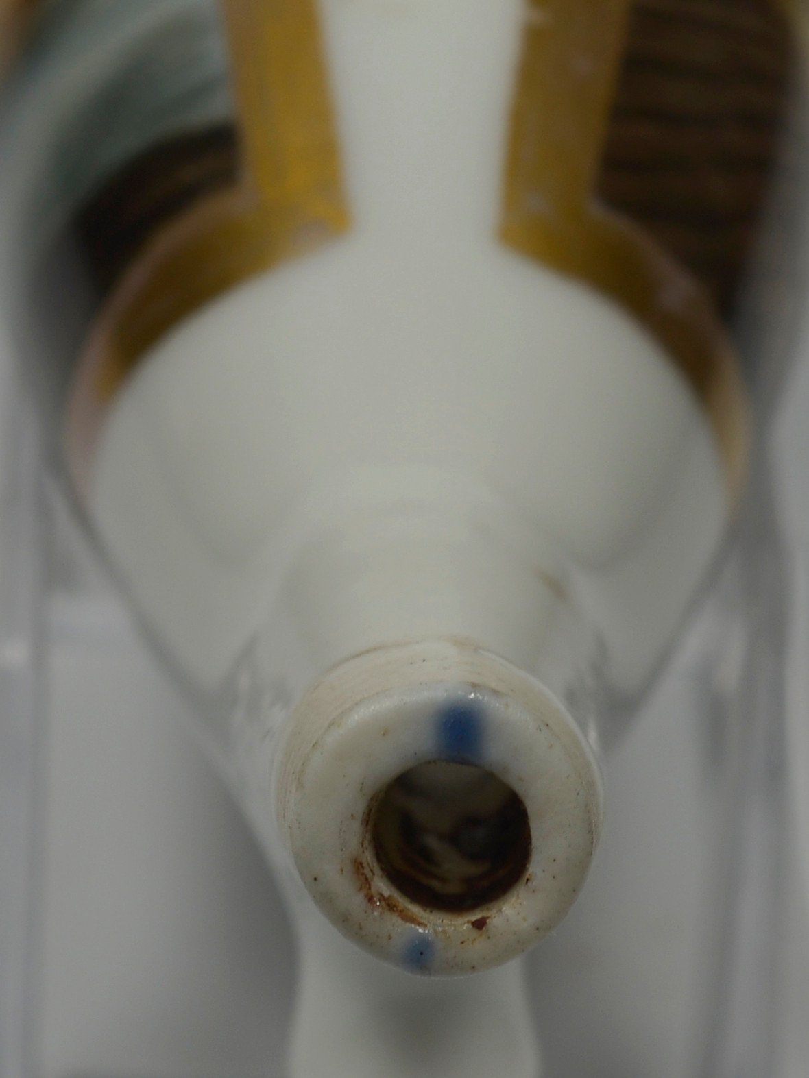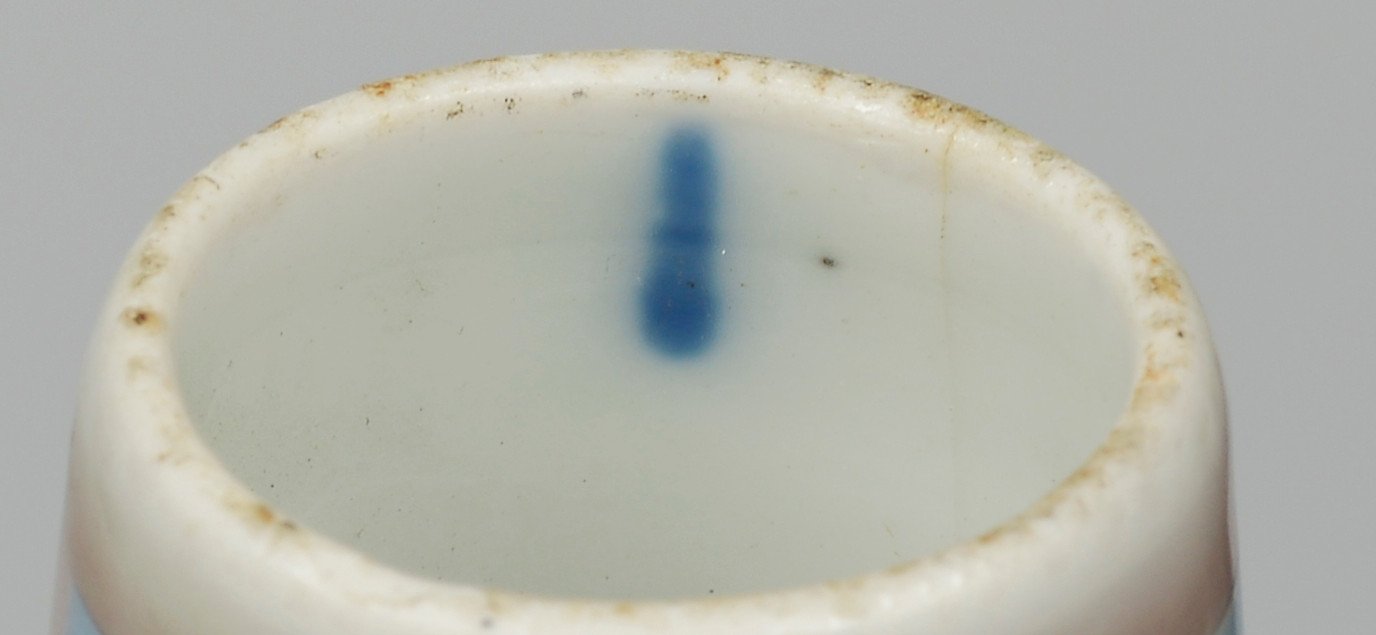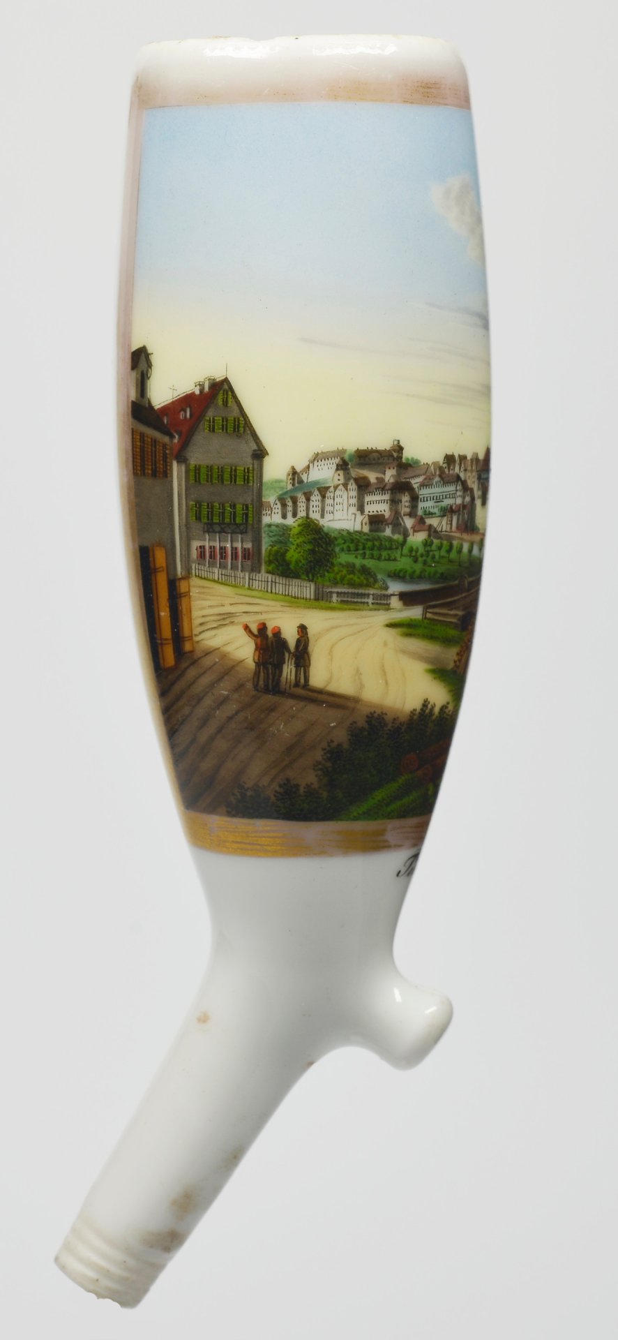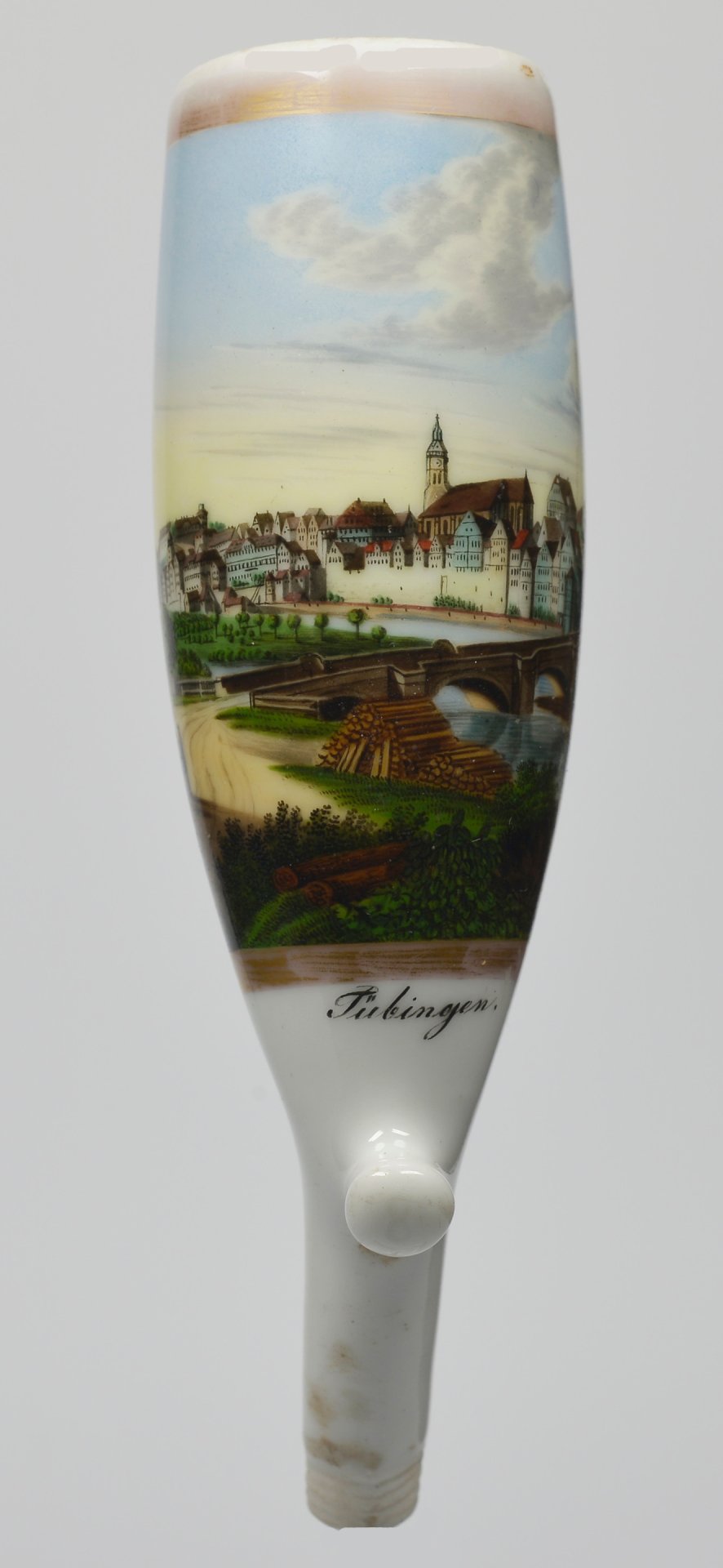 Pfeifenstummel aus Porzellan, Berliner Form, auf der Wandung 4/5 den gesamten Korpus umspannendes, golden gerahmtes Bildfeld; darin in bunten Muffelfarben das Panorama von Tübingen; unterhalb der Malerei in schwarzer Handschrift „Tübingen“: im Kessel unter Glasur senkrechter blauer Strich; blauer Querstrich am Stielende; Stummelferse Presszahl 8, H.: 12,4cm. (b=96,8; c=36,6 mm)