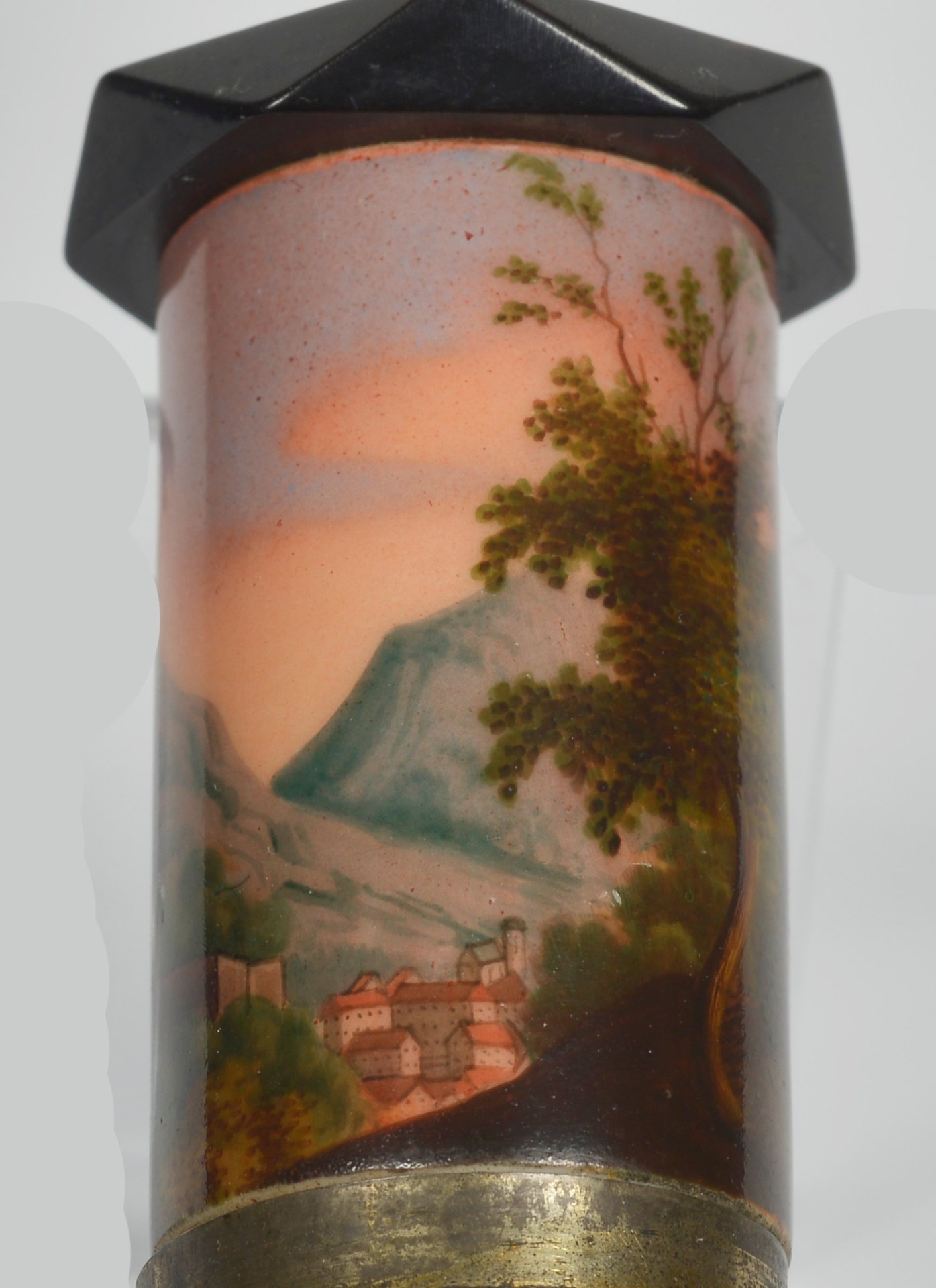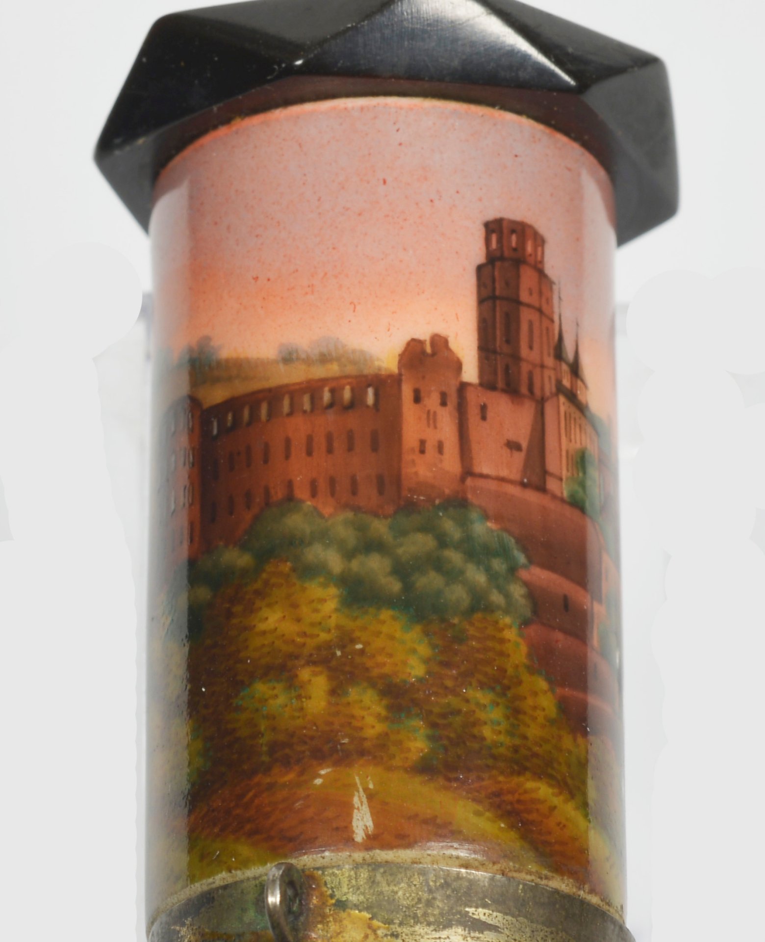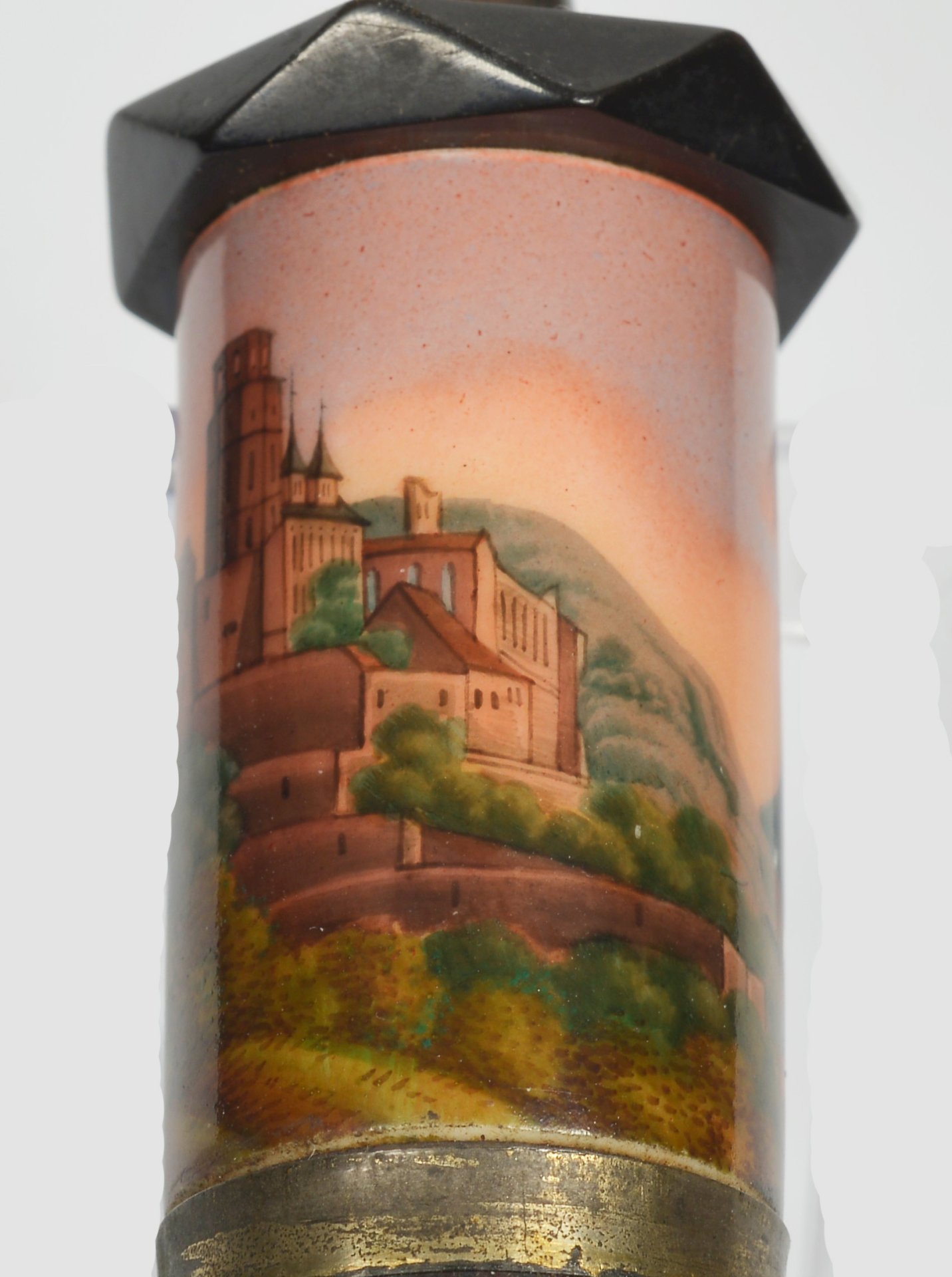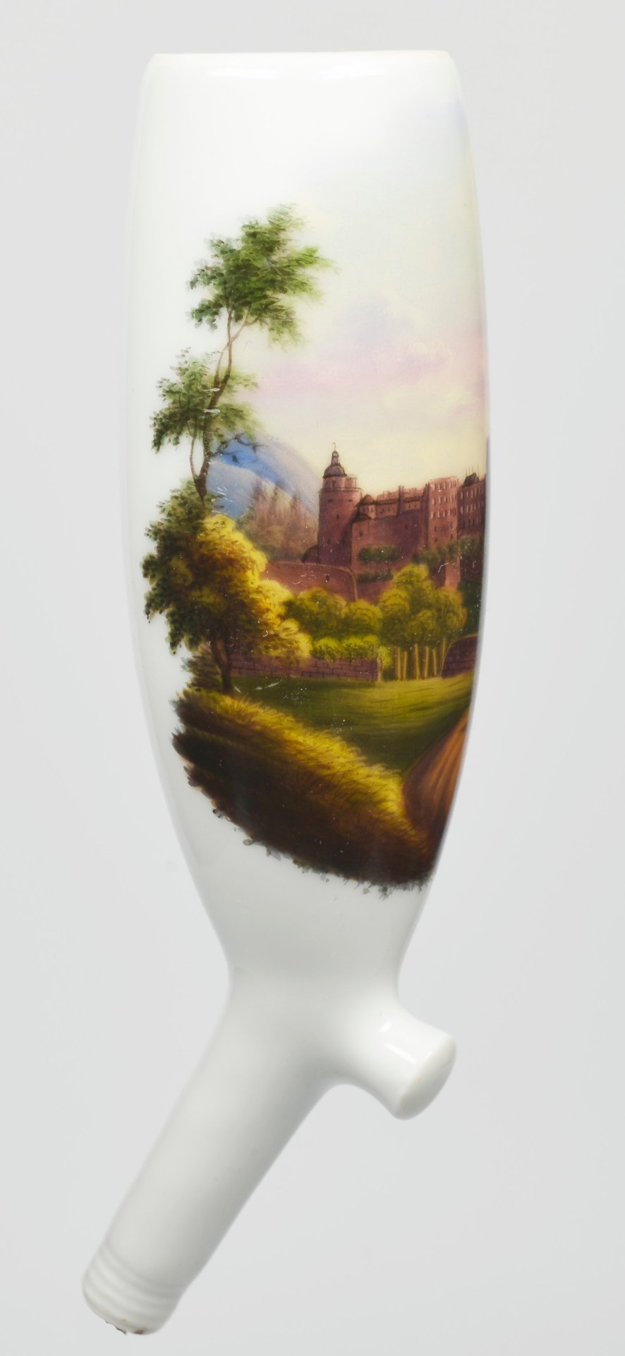 Pfeifenstummel aus Porzellan, Holländische Form (vergl. S 12, Morgenroth, Nr. 10, KPM 1822); auf der Wandung zu 2/3 den Korpus umspannendes Bildfeld, darin mit bunten Muffelfarben der Blick auf den Hang des Königstuhls und die Schlossruine aus rotem Sandstein; im Vordergrund zwei Wanderer; im Hintergrund der Fluß Neckar; Stummelferse Pressmarke 9; H.= 13,9 cm (b=109,5; c=38,9mm)