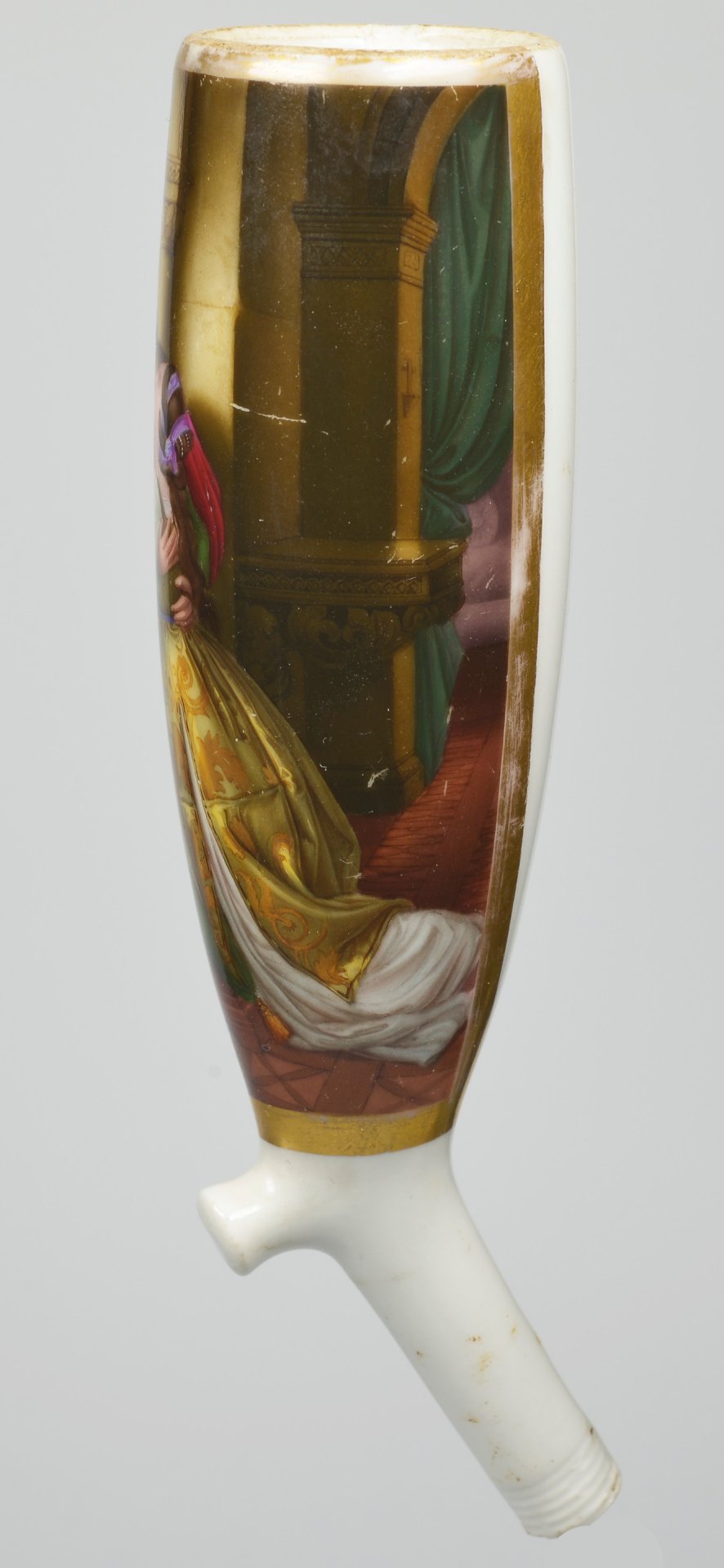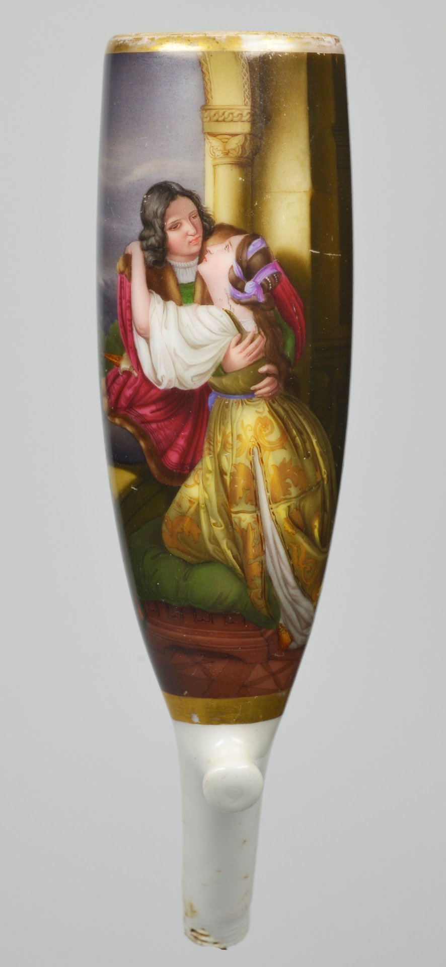 Pfeifenstummel aus Porzellan, Berliner Form, auf der Wandung zu ¾ den Korpus umspannendes, golden gerahmtes Bildfeld; in bunten Muffelfarben die Darstellung einer Szene aus Romeo und Julia; Romeo klettert auf einen Balkon, um Julia in die Arme zu nehmen; Ferse mit Presszahl 9; H=14,2 cm (b=111,9; c=38,5mm)
