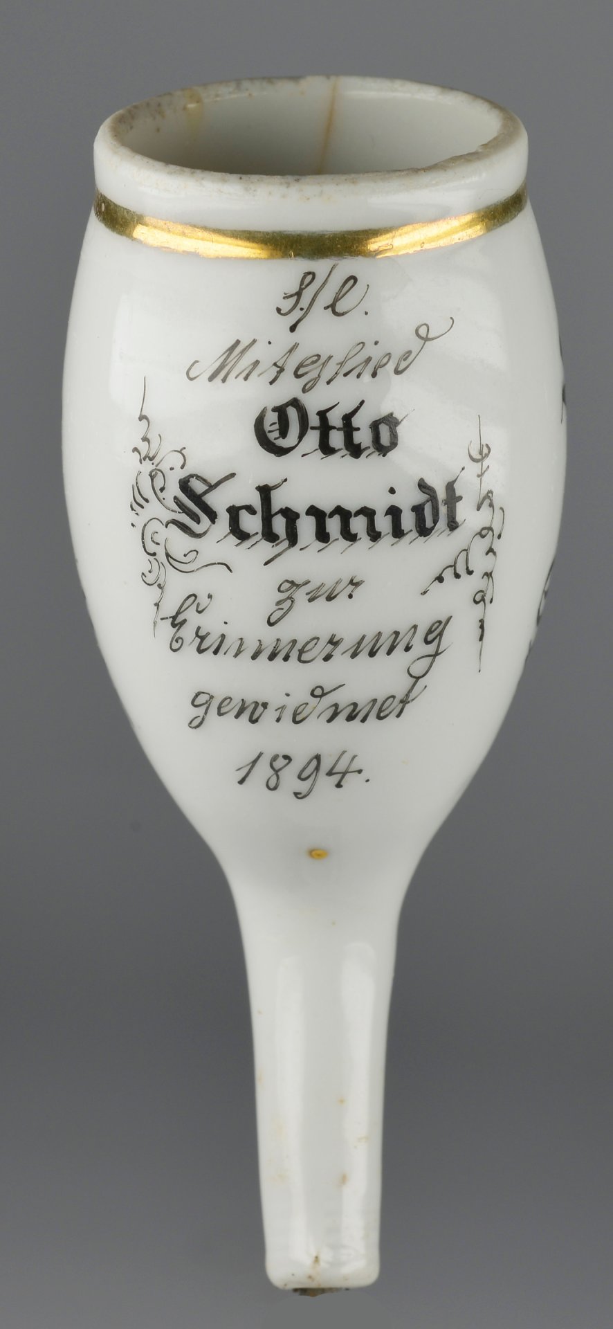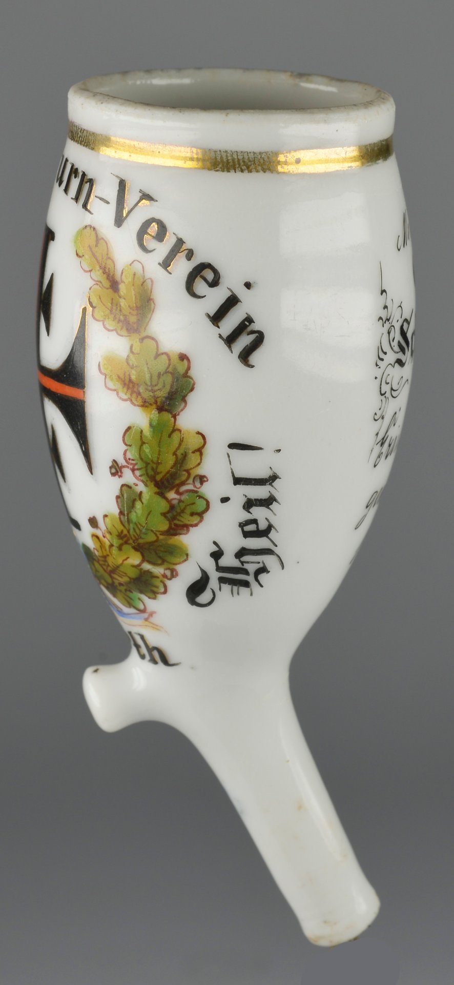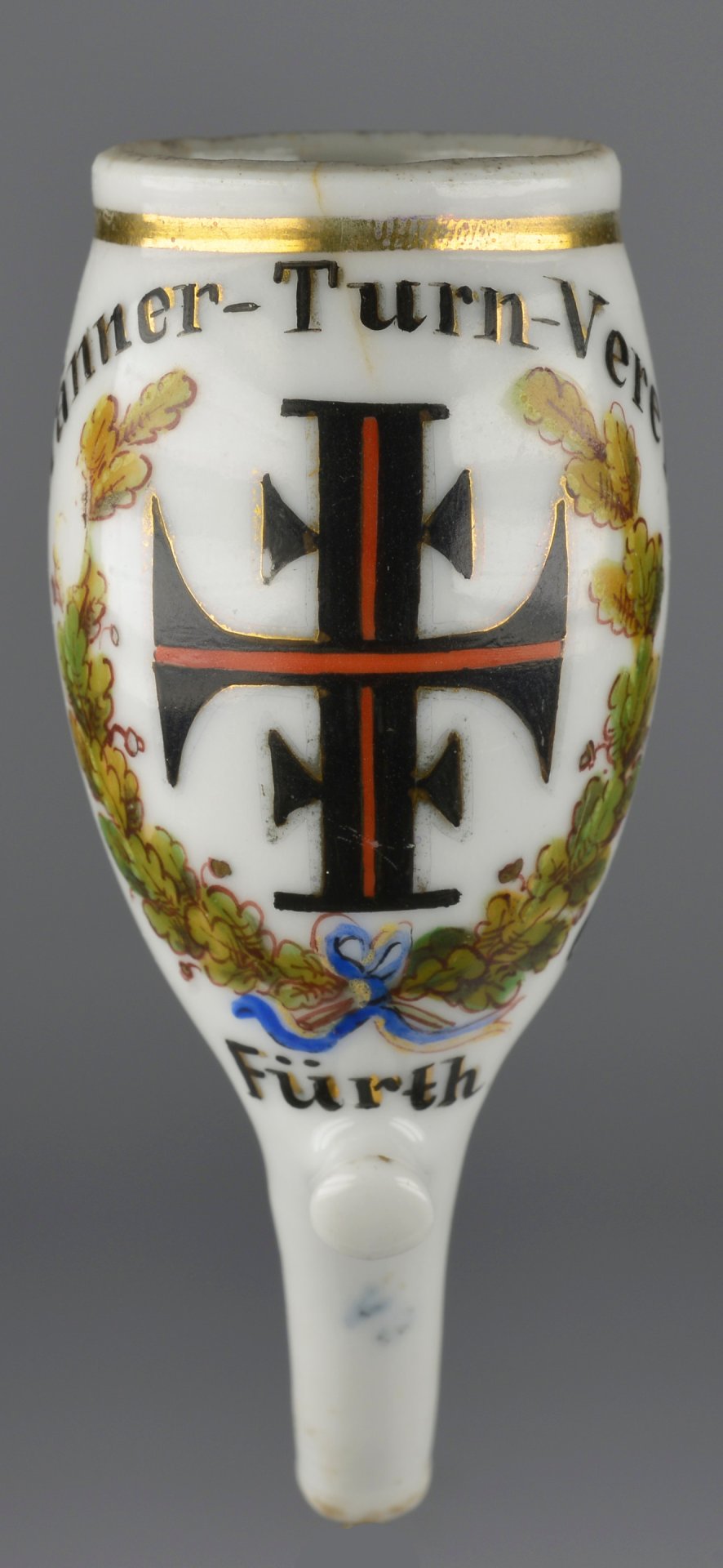 Porzellan-Pfeifenstummel, kurze bauchige Ausführung. oben geweitet, oben Goldrand, im Zentrum mit bunten Farben das Emblem FFFF, umgeben von einem Lorbeerkranz und oben in schwarz: Männer-Turn-Verein und unten Fürth. Auf der Rückseite in schwarzer Farbe: S/l Mitglied Otto Schmidt zur Erinnerung gewidmet 1894. H=9,1 cm (b=66; c=38,6 mm)