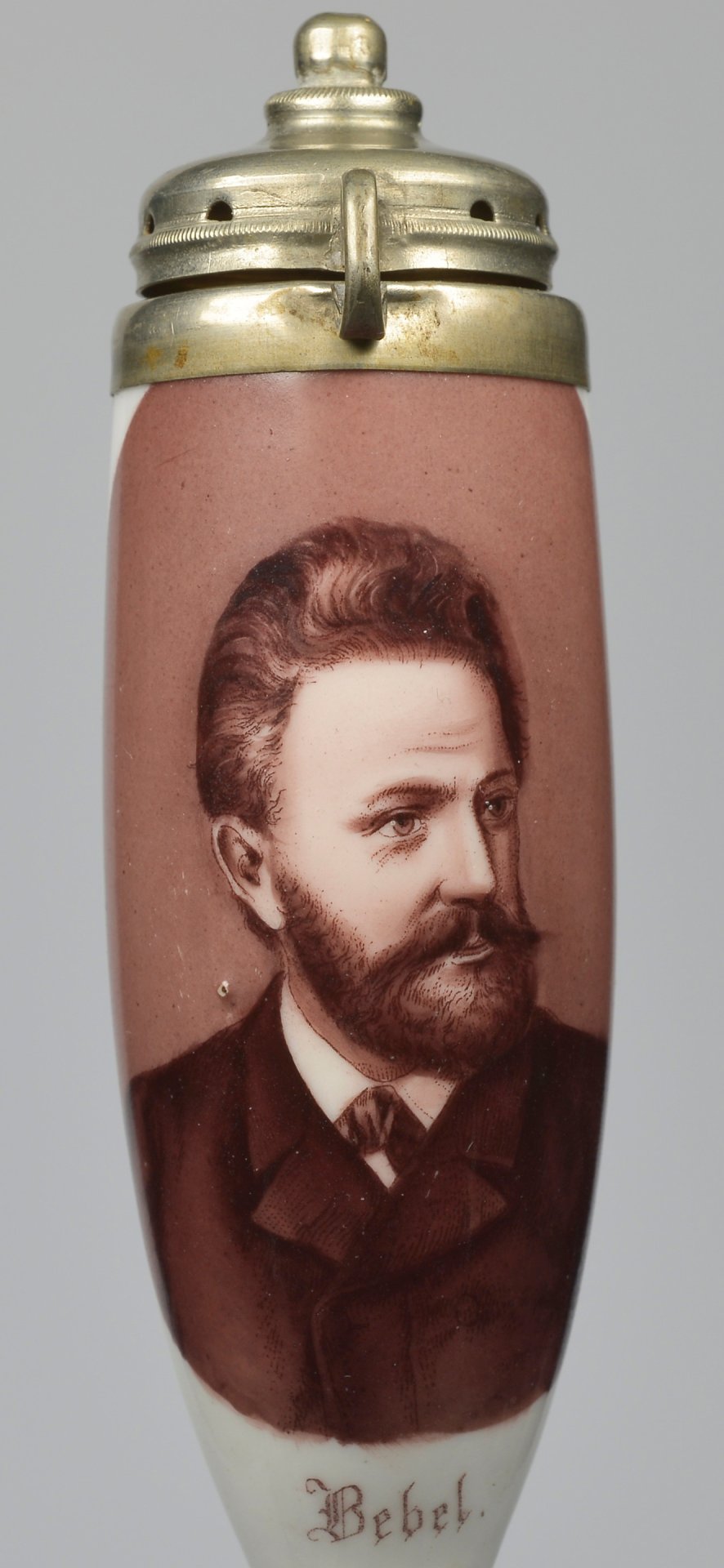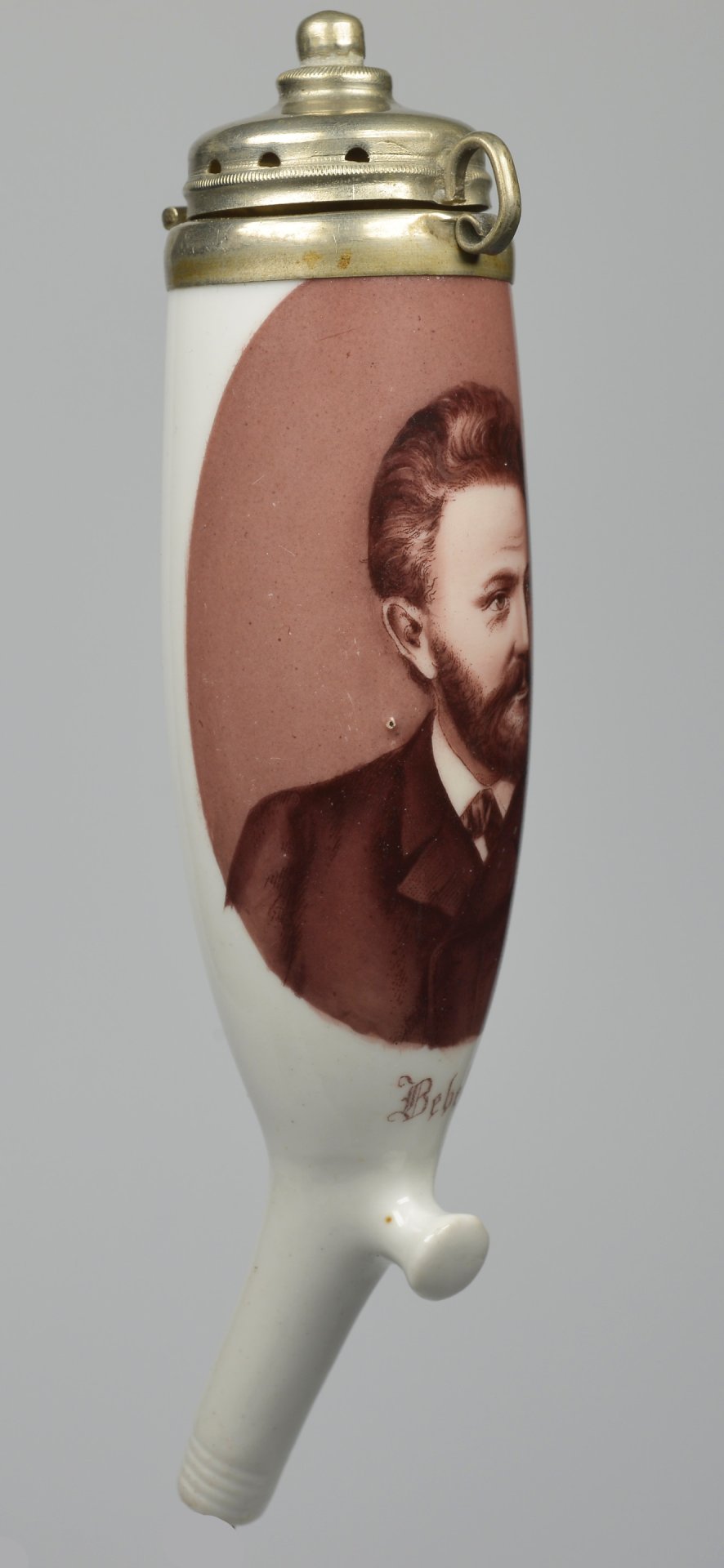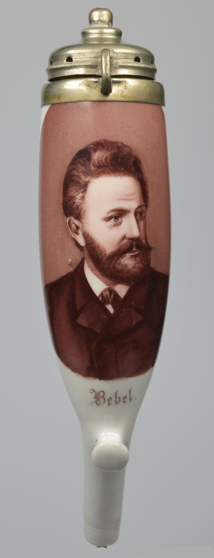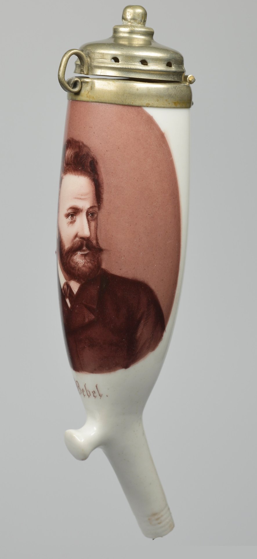Porzellanpfeifenkopf, Berliner Form, in einer zu 2/3 umfassenden ovalen Kartusche in Sepia (malerei) das Halbportait von August Bebel. Unter der Kartusche in Alt-Deutscher Handschrift die Aufschrift Bebel. “Bebel war sozialistischer deutscher Politiker und Publizist. Er war einer der Begründer der deutscheh Sozialdemokratie und dilt bis in die Gegenwart als eine ihrer herausragenden historischen Persönlichkeiten“ (Wikipedia). Montur: Alpacca; H=15,8 cm (a=135,4; b=107; c=38,1mm)