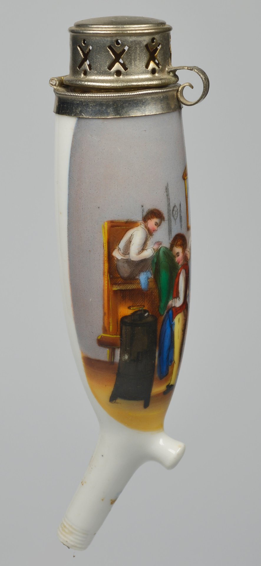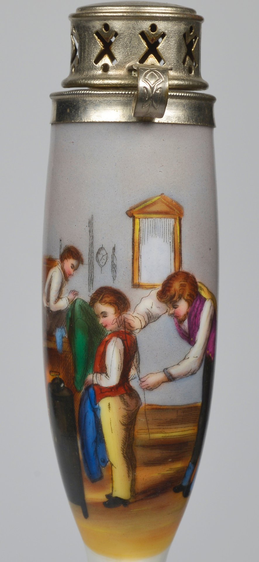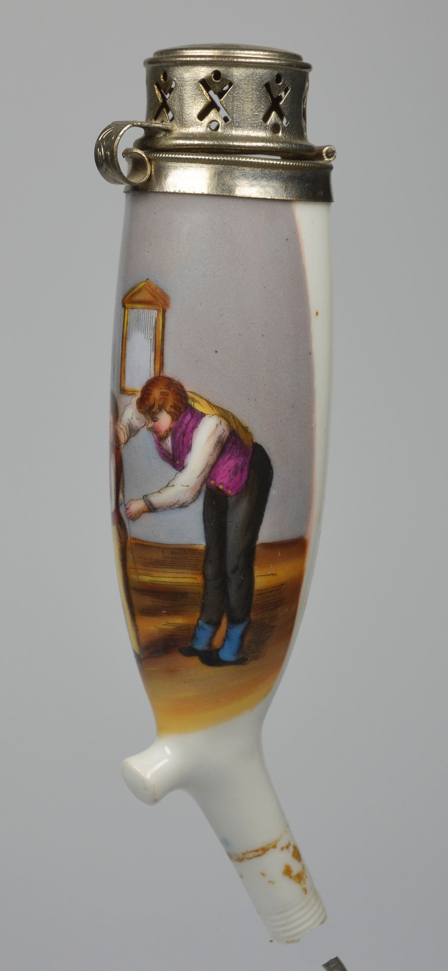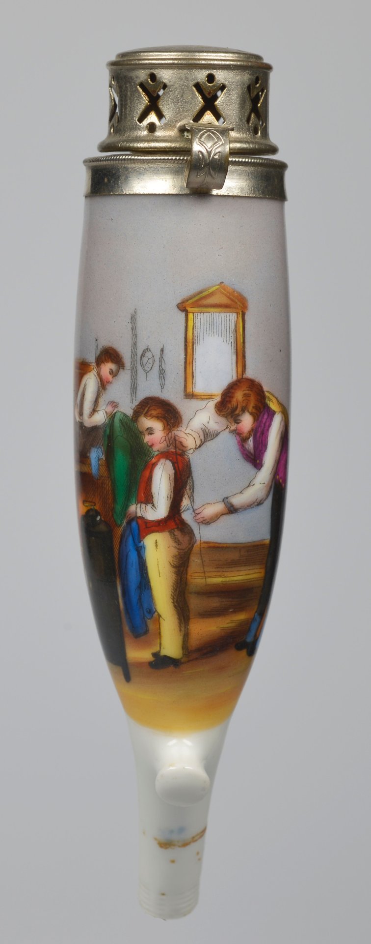 Porzellankopf, Berliner Form, mit bunten Muffelfarben zu 2/3 umfassende Darstellung einer Szene beim Schneider, indem einem Jungen Maß genommen wird und ein Dritter das Ergebnis aufschreibt; hohe Montur aus Blech; H=14,7cm (a=129,5; b=101,4; c=35,7mm)