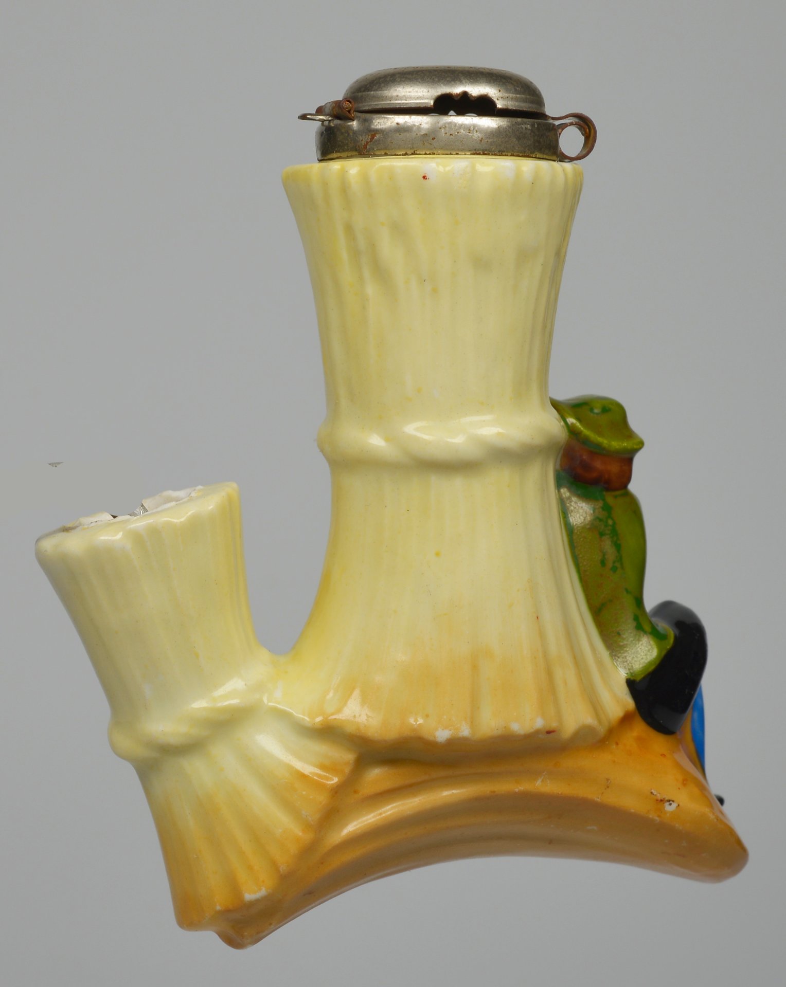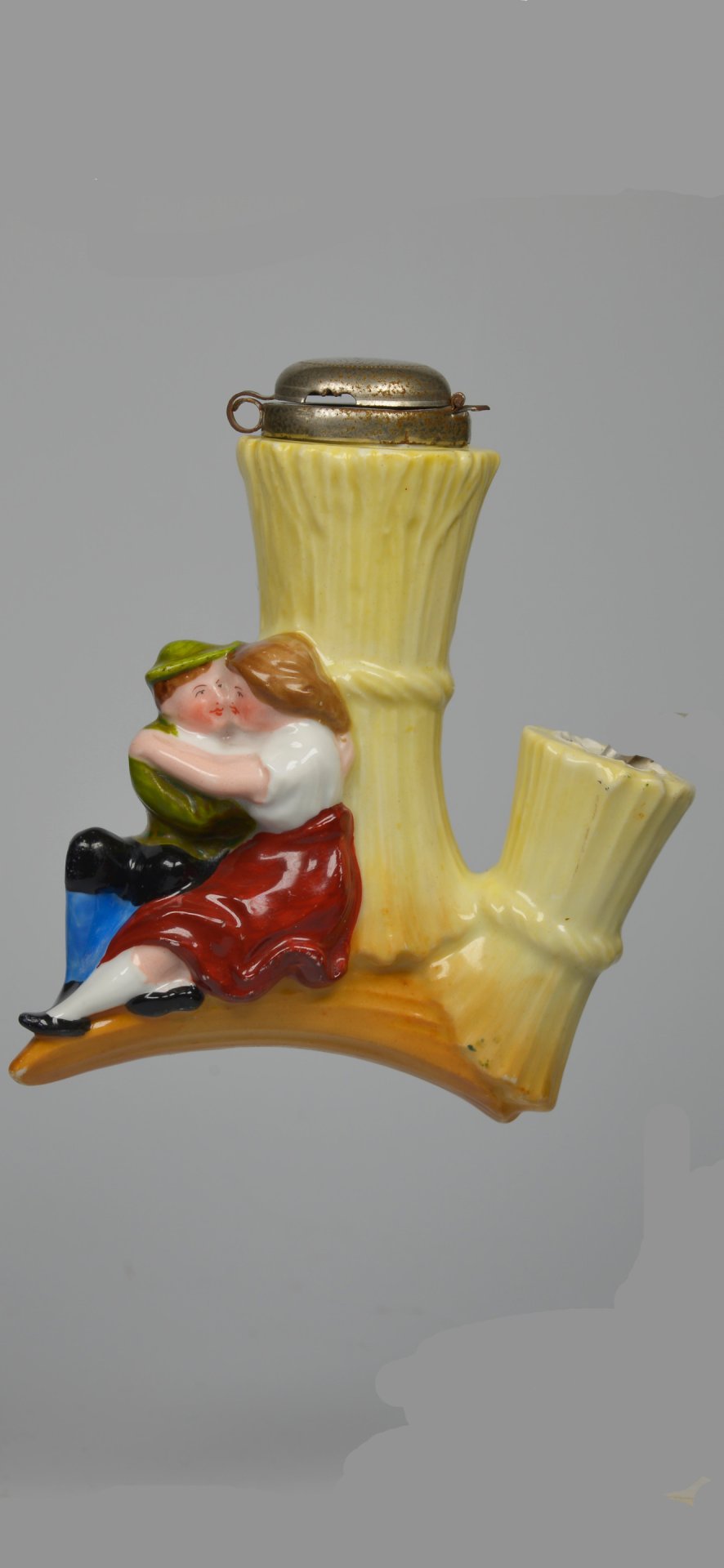 Pfeifenkopf mit seltener plastischer Ausformung und seitlich vollständiger Ansicht. Auf der Erde sitzend, an eine Strohgarbe gelehnt, sitzt mit polychromen Farben bemalt ein sich eng unschmiegendes Liebespaar. Deckel aus Blech mit leichten Rostspuren. H=109,5; B=38,4; T=107,1 mm