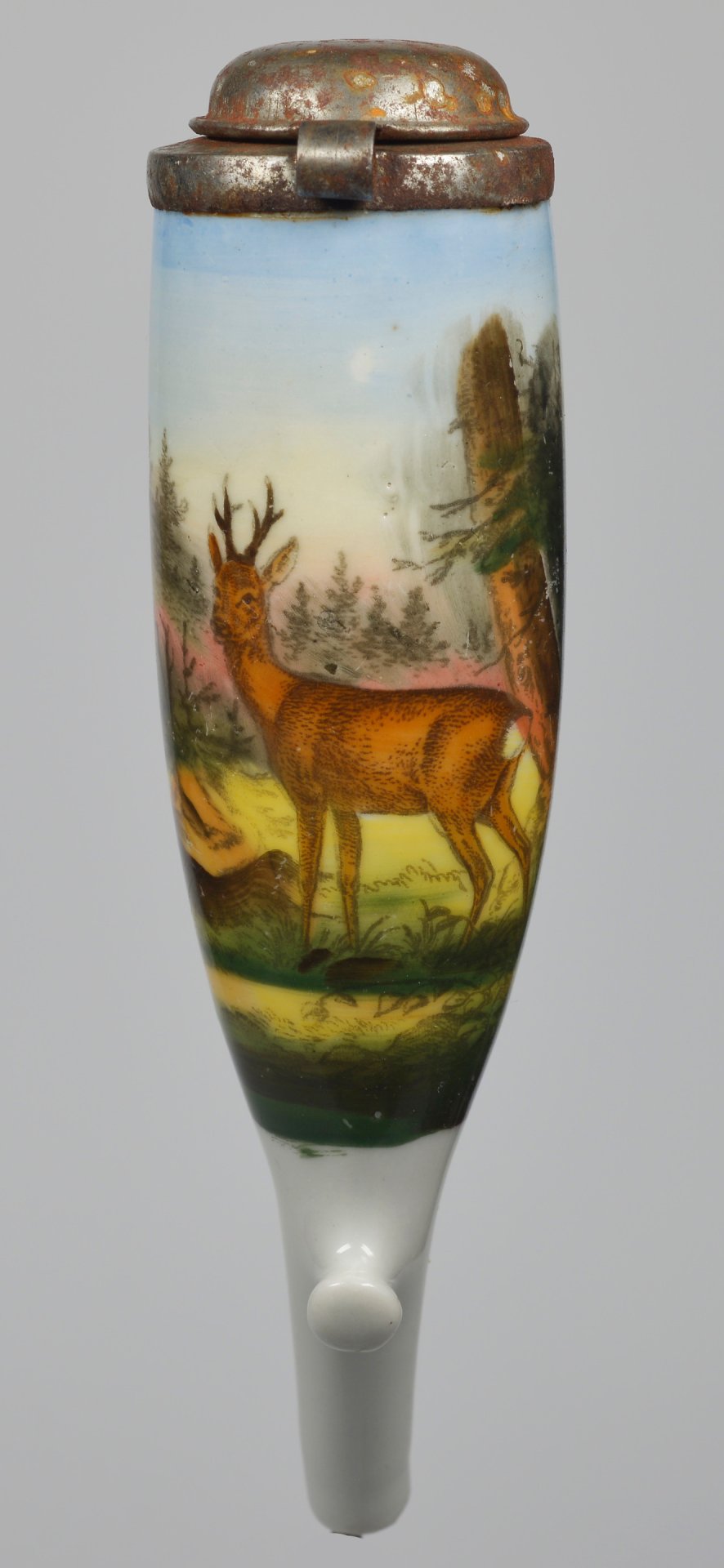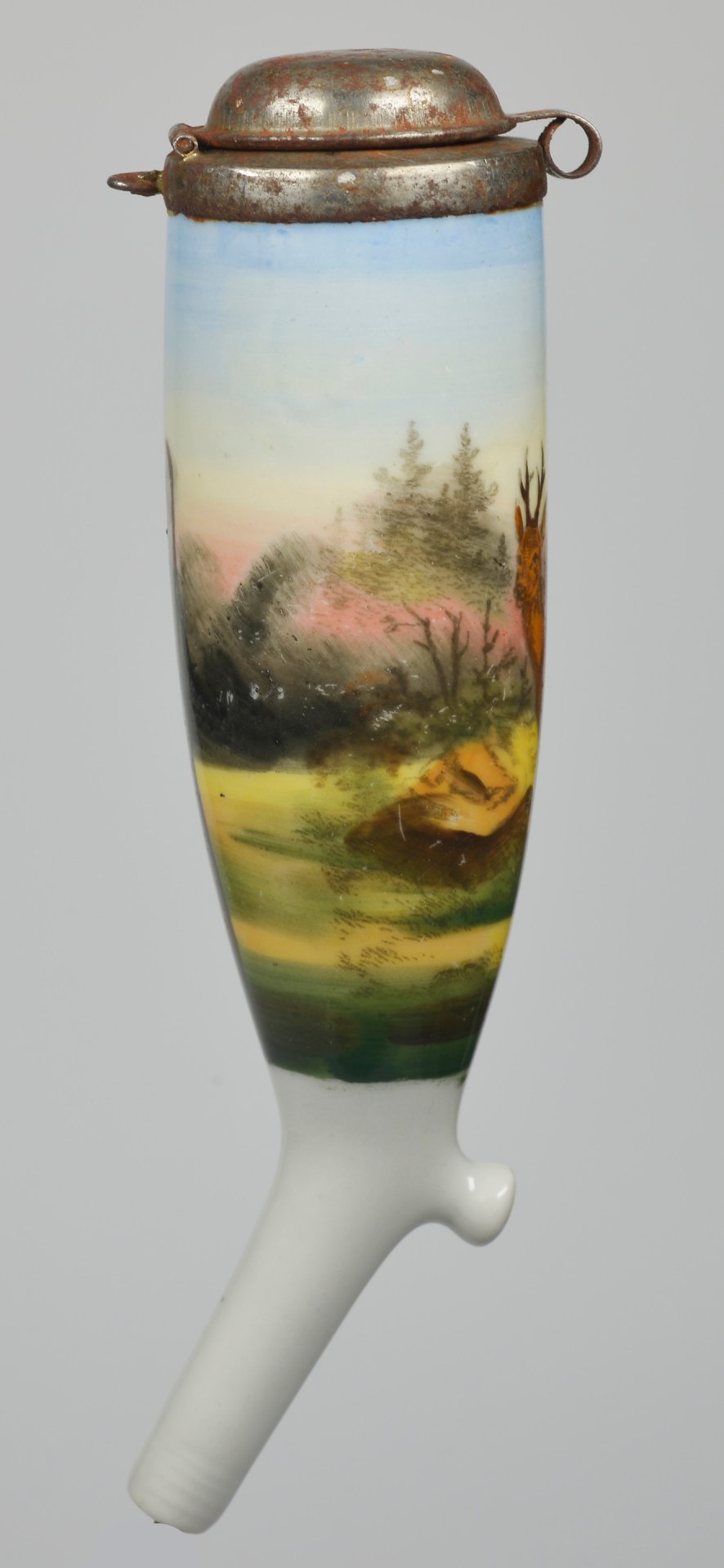 Pfeifenstummel aus Porzellan, umlaufend farbig abgebildete Waldgegend, auf einer Lichtung den Betrachter anschauender Hirsch; Montur aus verrostetem Blech; H=14,3cm (a=135,6; b=104,6; c=37mm)