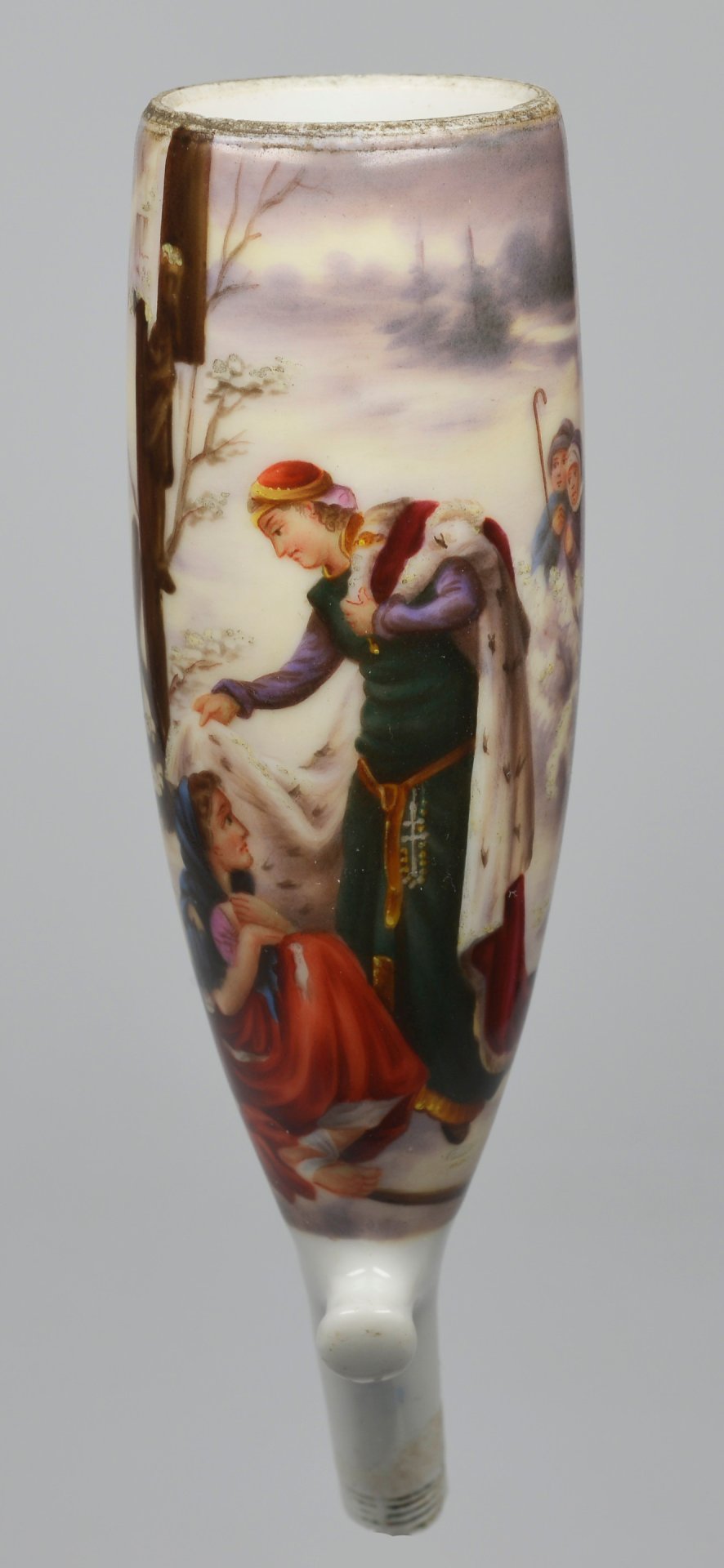 Pfeifenstummel aus Porzellan, mit bunten Muffelfarben den Korpus zu 2/3 umfassend die Darstellung von Elisabeth von Thüringen, wie sie in tiefem Schnee einer Bettlerin einen Fellmantel als Umhang reicht; sie wird von drei Kindern, die abseits im Schnee stehen, beobachtet; auf der Rückseite ist in schwarz handschriftlich vermerkt: „Landgräfin Elisabeth von Thüringen und die Bettlerin“; H=12,8cm (b=101; c=36,5mm)