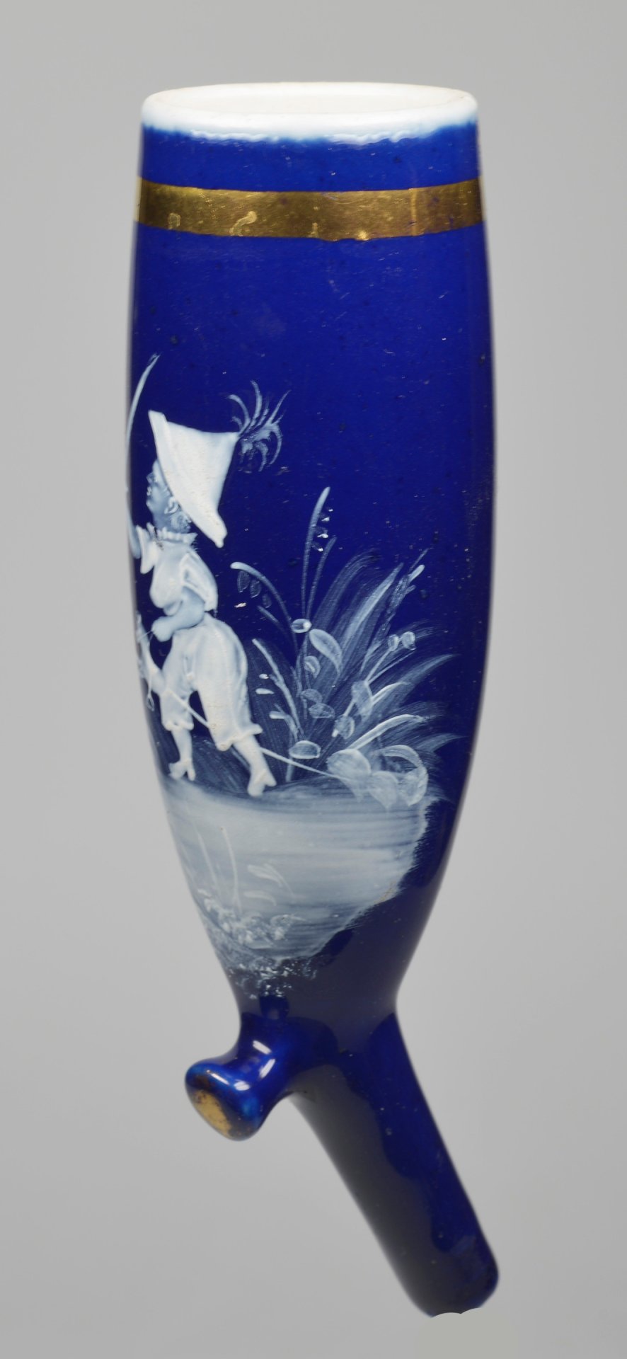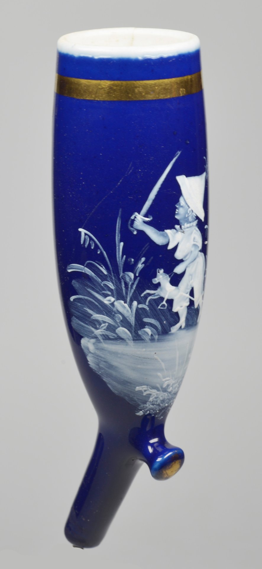 Porzellanpfeifenkopf, Berliner Form, der Korpus wurde vollständig mit blauer Emaille überzogen und oben mit einer Goldleiste umlaufend dekoriert; die Schauseite wurde zu 2/3 mit Emaille-Schneemalerei bearbeitet und stellt ein Kind mit Papiermütze, einem Säbel und am Fuß mit einem Steckenpferd in einer mit Gräsern bewachsenen Landschaft dar. Dieser außergewöhnlich fein gearbeitete Porzellan-Pfeifenkopf stammt aus der Blütezeit der Thüringer Porzellanmanufakturen und ist dem Übergang vom Späthistorismus zum Jugendstil zuzuordnen (ca. 1895–1915).