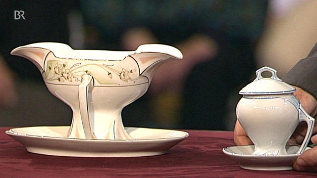 E.: (die grüne Brückenmarke am Boden wird gezeigt) BPM das ist Buckauer Porzellanmanufaktur in der Nähe von Magdeburg. Zu Beginn des 20. Jahrhunderts, zur Zeit des Jugendstils, durchaus ne bekannte Porzellanmanufaktur, bei der so interessante und begabte wichtige Designer wie Albinmüller zum Beispiel gearbeitet haben. In dem Falle bin ich mir nicht so ganz sicher, wer das Design, den Entwurf gemacht hat. Ich denke, es gibt da noch ein, zwei Namen Max und Fritz von Heider, die ursprünglich aus München kamen. In München auch ihre Ausbildung bekamen. Meines Wissens Bildhauer, Porzellanmaler ursprünglich und sich dann aber auch der Formgebung verschrieben haben bei eben der Buckauer Porzellanmanufaktur. Ja das ist immer glaub ich so'n Problem, wenn so'ne Manufaktur nicht wirklich gut erforscht ist und wenn sie danach suchen nach irgendwelchen Fakten, nach Unterlagen, nach Literatur, ich glaube, es gibt kaum was dazu und deshalb auch die Unsicherheit mit ner Zuschreibung. Was jedenfalls auffällt bei diesen Stücken ist die Qualität dieser Sachen., von der Formensprache auch. Das hilft uns einerseits das einzuordnen. Das dürfte um 1900, kurz nach 1900 sein. Es sind so ganz deutlich Jugendstilelemente, diese geschwungenen Teile. Leider weiß man nicht sehr viel über die Manufaktur und auch über die beiden Künstler. Man erkennt den Stil. Die beiden Objekte kommen sicherlich auch aus der gleichen Serie, natürlich vom Dekor her unterschiedlich ausgeführt. Benutzen Sie eigentlich die Sachen, weil das ist hier eine Sauciere, die man ja schön auf den Tisch stellen könnte?