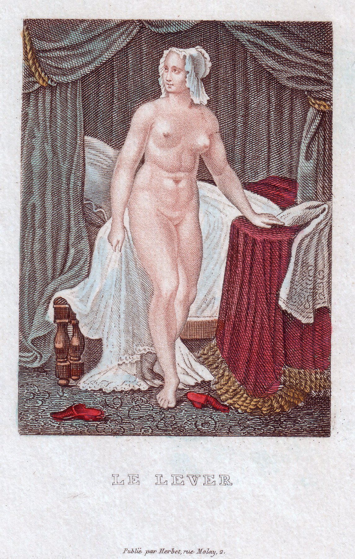 Kolorierter Punktierstich, bezeichnet: „Le Lever“, Publié par Herbet, rue Moley, 2 (wohl Paris), Blatt: 22,5 x 16 cm; Abbildung: 8,5 x 6,4 cm