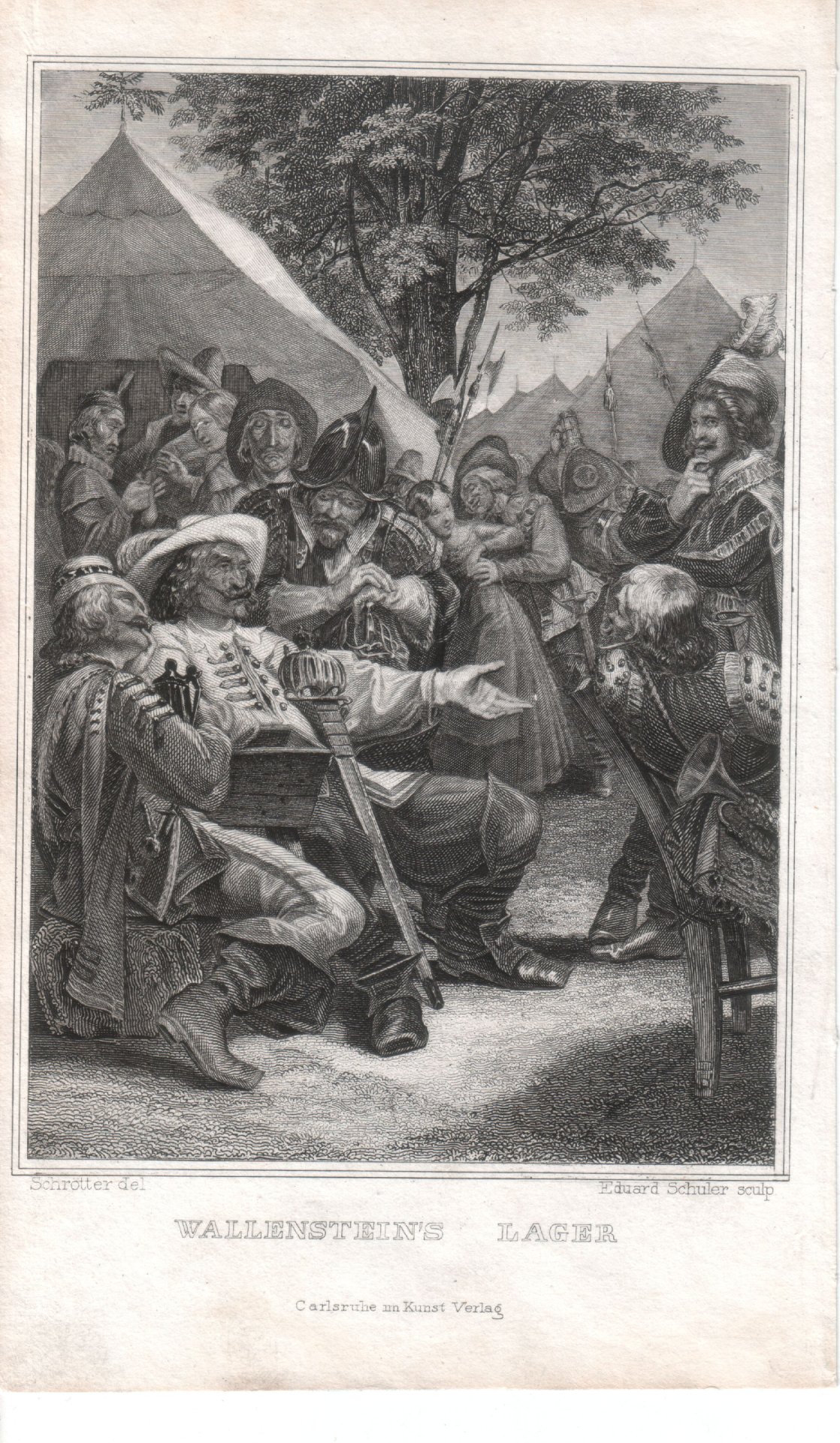 Eduard Schuler (1806 – 1882) Stahlstich, bezeichnet: „Wallensteins Lager“ nach einem Motiv von Adolf Schrödter (1805 – 1875), gedruckt Carlsruhe im Kunst Verlag; Blatt: 19 x 12 cm, Abbildung: 15,1 x 10,6 cm