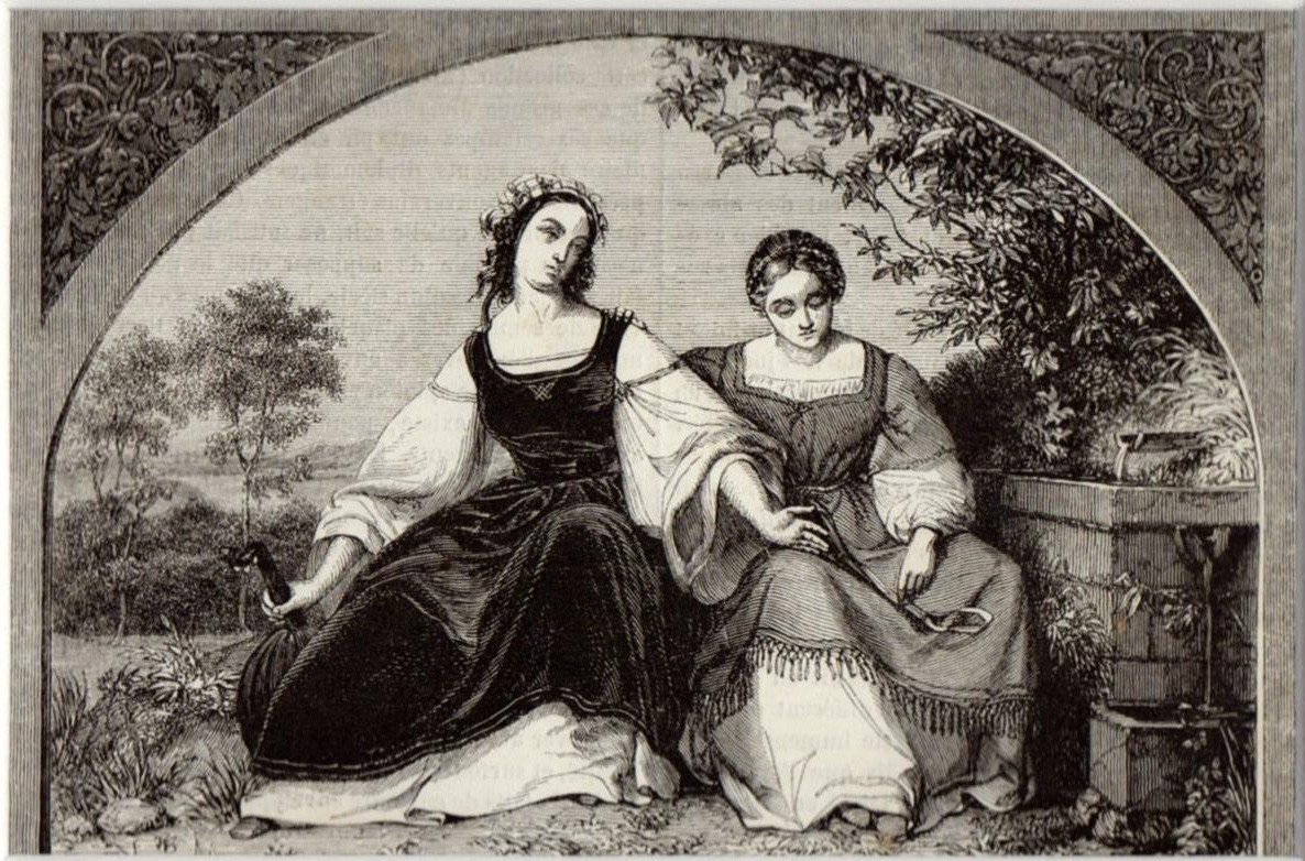 Holzstich, Les jeunes filles a la fontaine, par M. Bendemann, aus « Le magasin pittoresque », Paris 1842, Blatt : 18 x 24cm, Ansicht : 9,5 x 14,5cm