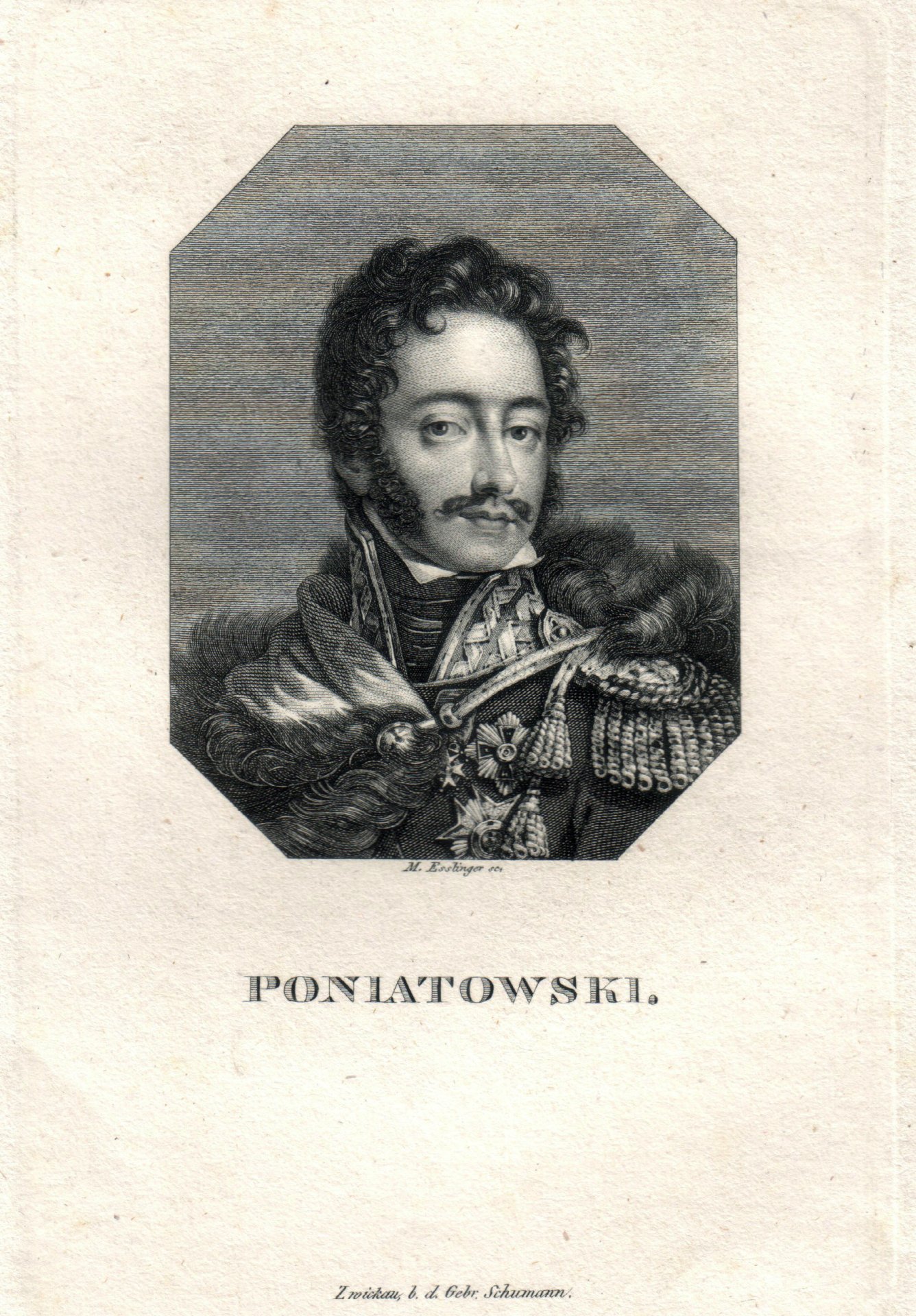 Kupferstich von Johann Martin Esslinger (1793-1841), bezeichnet „Poniatowski“, mit Darstellung des Halbportraits von Józef Antoni Poniatowski (1763 - 1813), gedruckt in Zwickau, b. d. Gebr. Schumann. Blatt: ca. 26,5 x 21.7 cm; Platte: ca. 16 x 10,3 cm.