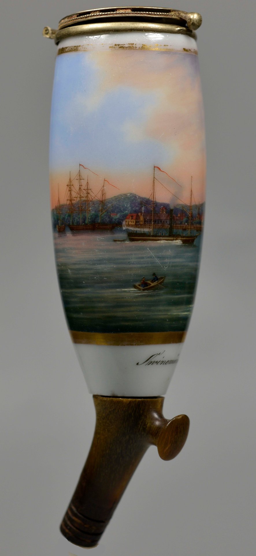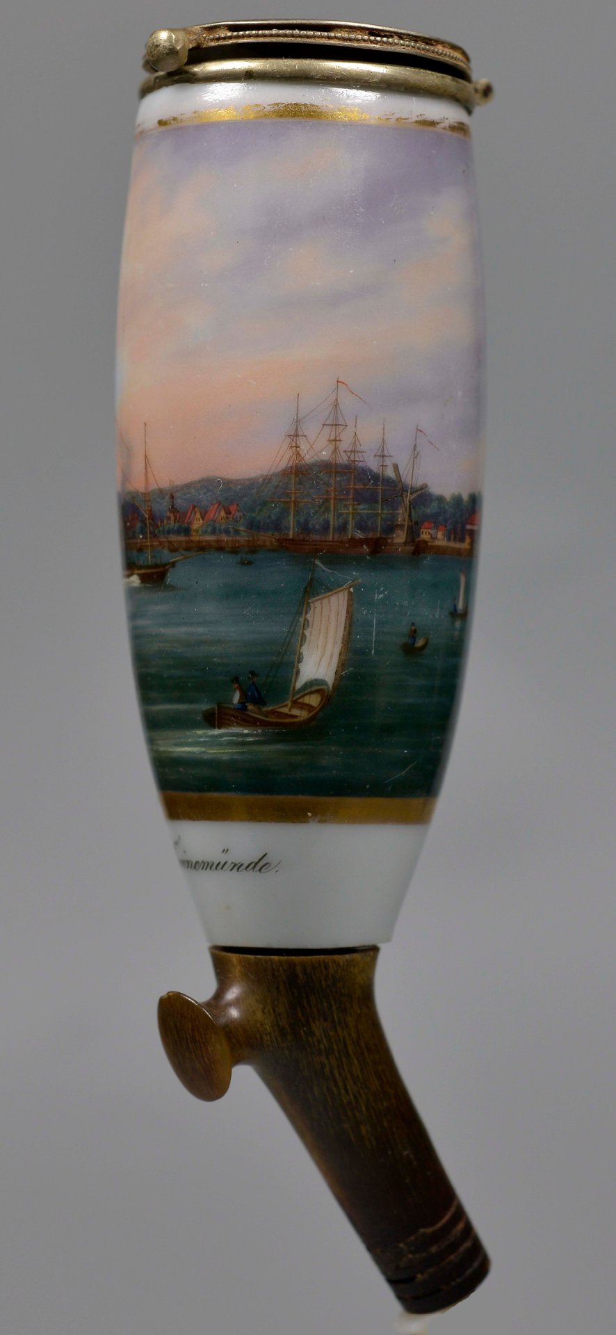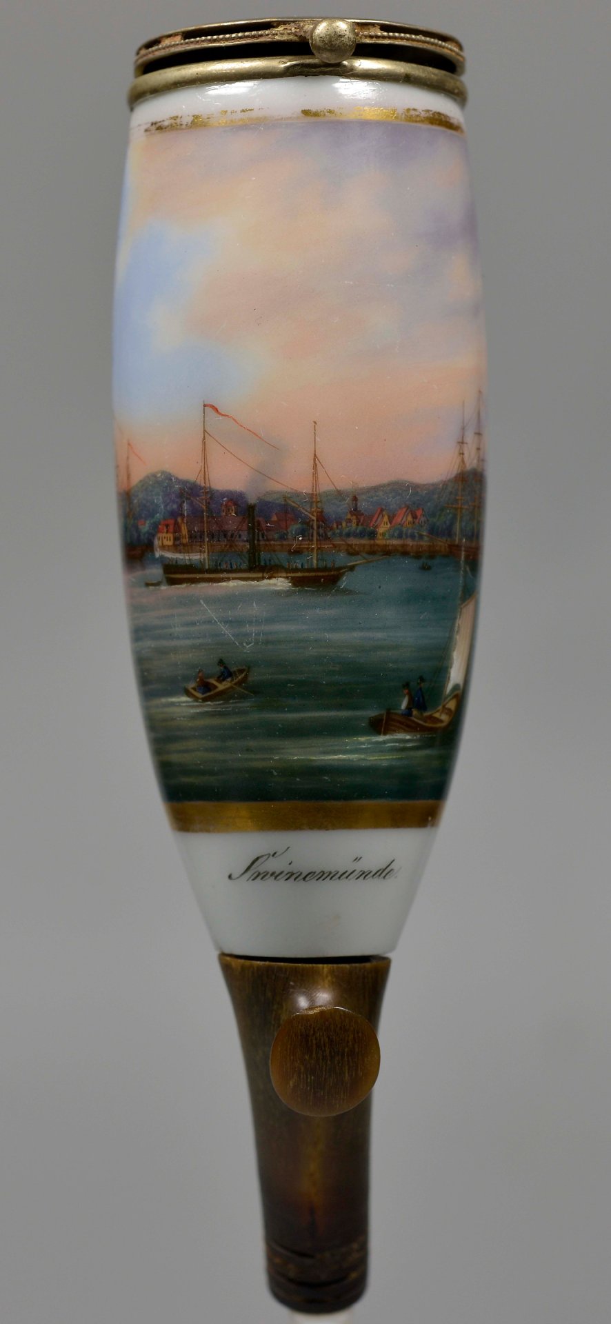 Pfeifenstummel aus Porzellan, den Korpus beinahe umlaufend in Goldleiste eingefasste Rechteckkartusche, darin mit bunten Muffelfarben in feiner Lupenmalerei die Ansicht von Swinemünde und Booten auf der Ostsee; im Kessel unterglasurblauer senkrechter Strich, Stiel und Ferse ersetzt durch Hornnachbildung, Montur: Neusilber Fa. Brands in Erlangen; H=12,7 cm