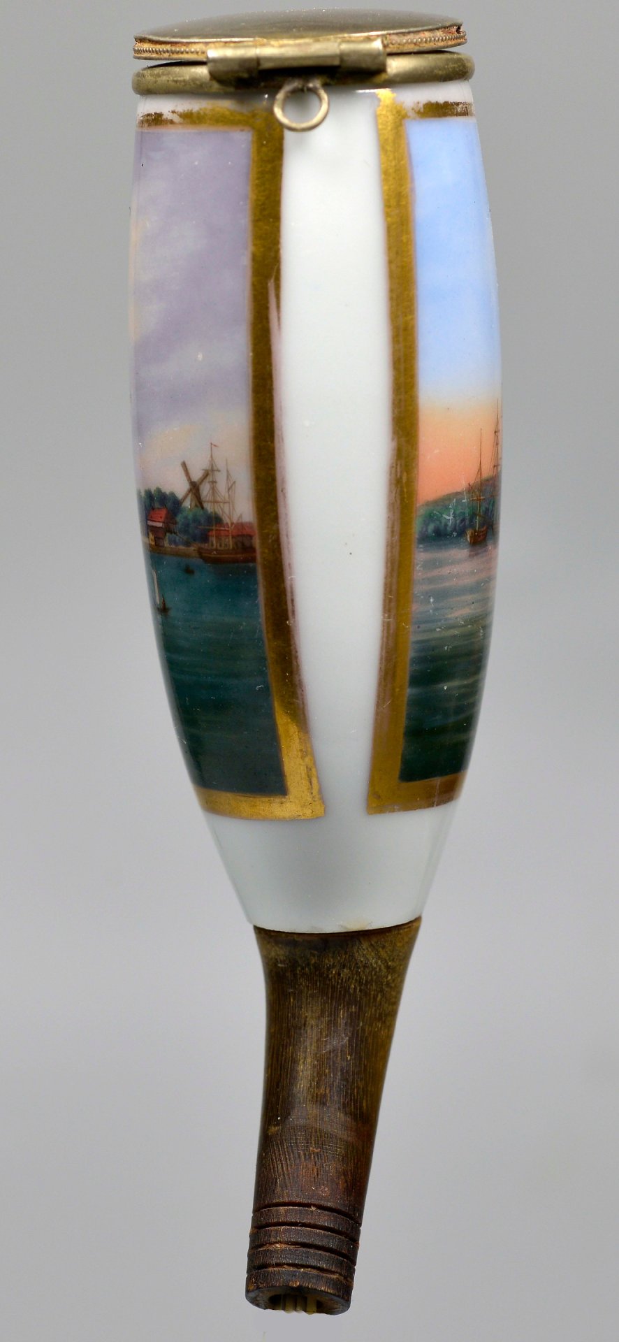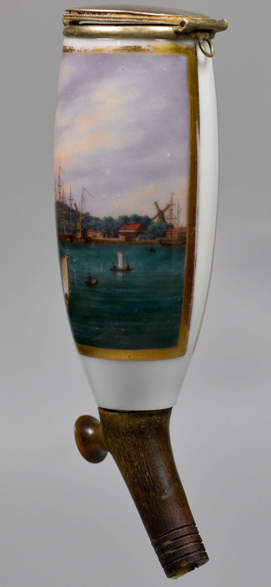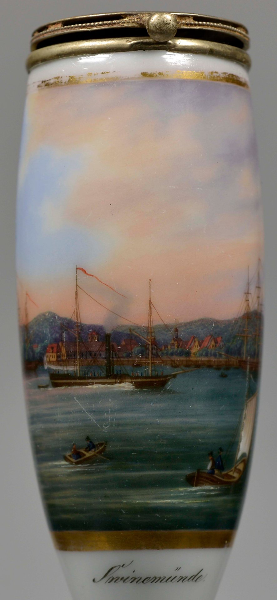 Pfeifenstummel aus Porzellan, den Korpus beinahe umlaufend in Goldleiste eingefasste Rechteckkartusche, darin mit bunten Muffelfarben in feiner Lupenmalerei die Ansicht von Swinemünde und Booten auf der Ostsee; im Kessel unterglasurblauer senkrechter Strich, Stiel und Ferse ersetzt durch Hornnachbildung, Montur: Neusilber Fa. Brands in Erlangen; H=12,7 cm