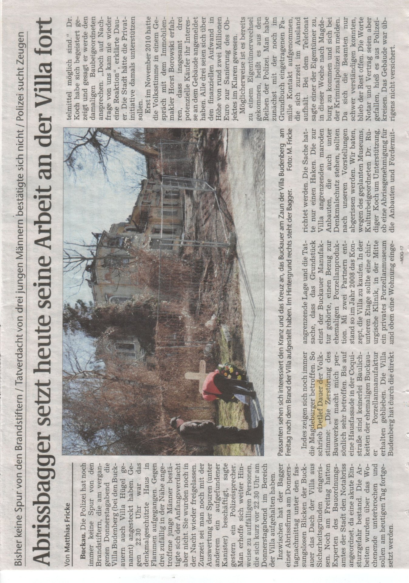 21.03.2011 Volksstimme, Abrissbagger setzt heute seine Arbeit an der Villa fort