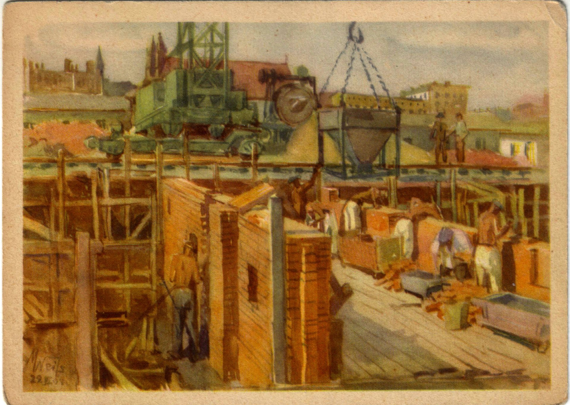 Die Karte ist Teil einer größeren Edition unter dem Titel: „Alle Kraft für den Aufbau Magdeburg“, gedruckt 1954. Sie zeigt die Bauarbeiten im Zentrum 1953/54 und ist unten links signiert: M Weiß 29,VI.53, neben dem Stein-auf-Stein-Mauern auf einer Baustelle sind im Hintergrund die Ulrichskirche, der Dom und ein bereits fertig gestellter neuer Bau zu sehen.