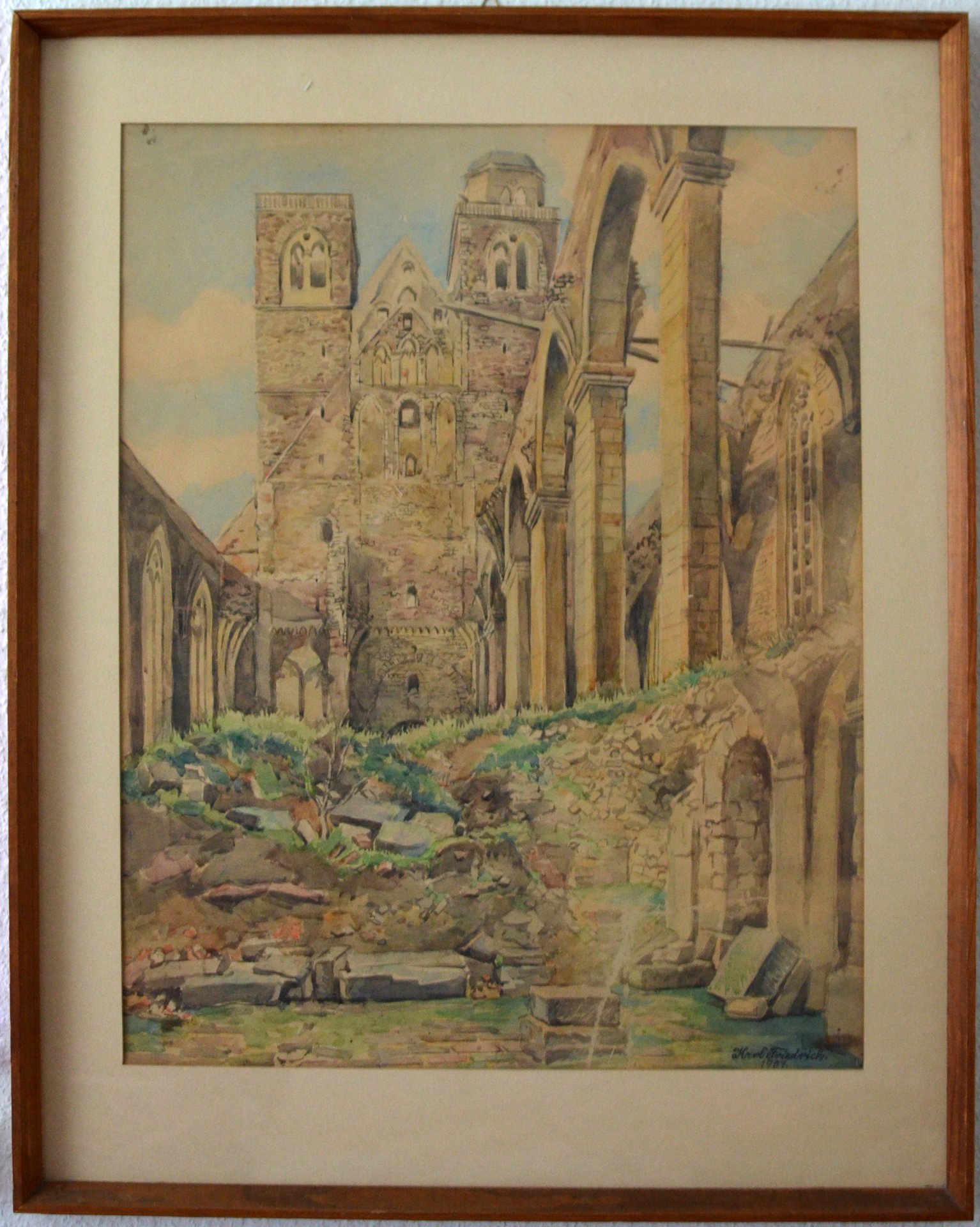 Karl Friedrich (1898-1989), Aquarell, signiert unten rechts: Karl Friedrich 1951, Magdeburg Johanniskirche 1951, Kriegszerstörung 1945 von innen, Bild in zeitgenössischem Rahmen, Passepartout, sichtbare Fläche: 62 x 48 cm; Rahmen: 68,5 x 61,5 cm