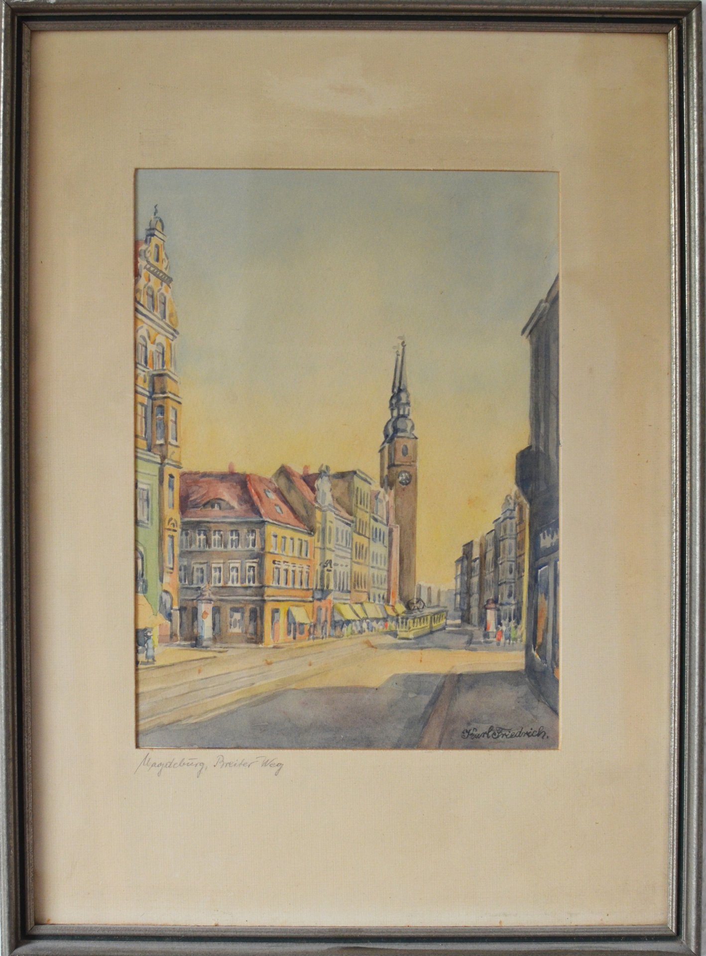 Karl Friedrich (1898-1989), Aquarell, signiert im Bild unten rechts „Karl Friedrich“ und auf Passepartout unterhalb der Darstellung „Magdeburg, Breiter Weg“; Darstellung des nördlichen Teils des Breiten Weges von Magdeburg vor der Zerstörung 1945 mit Blick von Norden. Rahmung wohl 50er Jahre. Bildausschnitt: 31 x 22,5 cm; Rahmen: 51,5 x 38 cm.