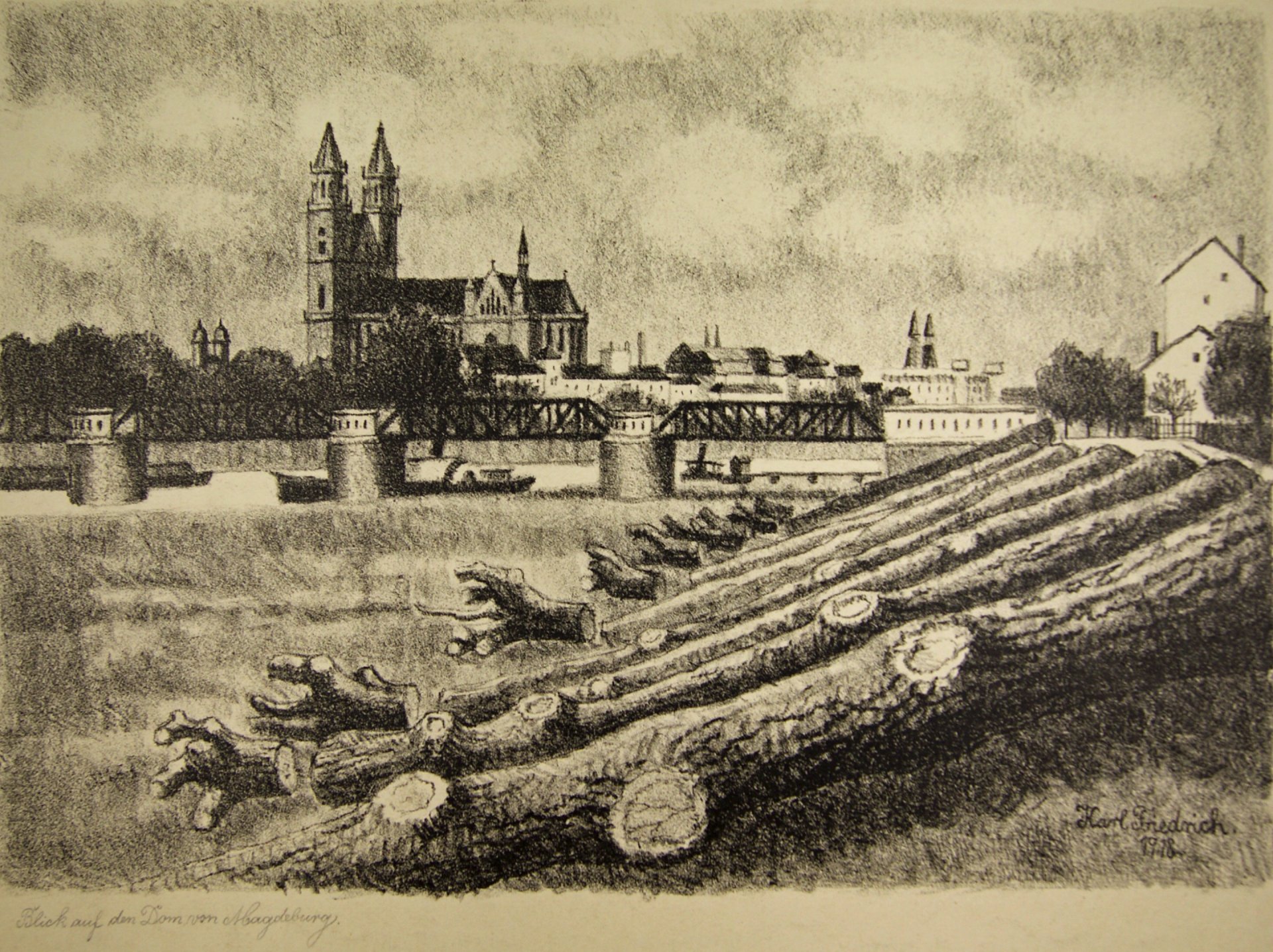 Karl Ludwig Ferdinand Friedrich (1898-1989), Lithographie, im Bild signiert unten rechts: „Karl Friedrich 1918“, unter dem Bild mit Bleistift: „Blick auf den Dom von Magdeburg“; Blatt: 49 x 62,5 cm; Abbildung: 29,5 x 42,5 cm.