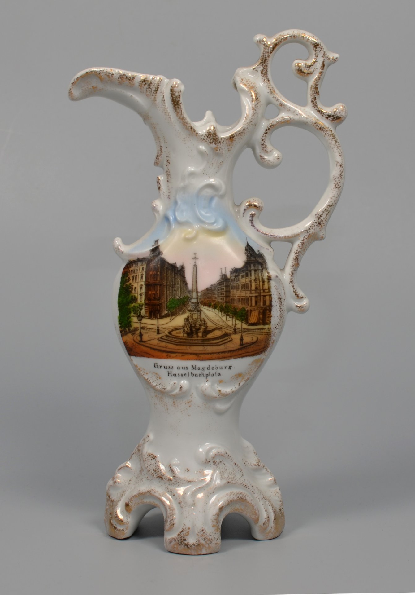 Vase in Kannenform; hochgezogener Fuß mit vier von reliefierten C-Schwüngen begleiteten Einziehungen; flach-ovoider Korpus mit eingezogener Schulter; Gießlippe weit ausgezogen; an der Seite bandartiger Henkel mit mehreren, teils gegenläufigen C-Schwüngen;  Rocaillen gerahmtes Bildfeld mit Abziehbild; darunter in Schwarz: „Gruss aus Magdeburg Hasselbachplatz“; Rückseite in Weiß; ohne Marke, große Presszahl  1051, H.: 19cm