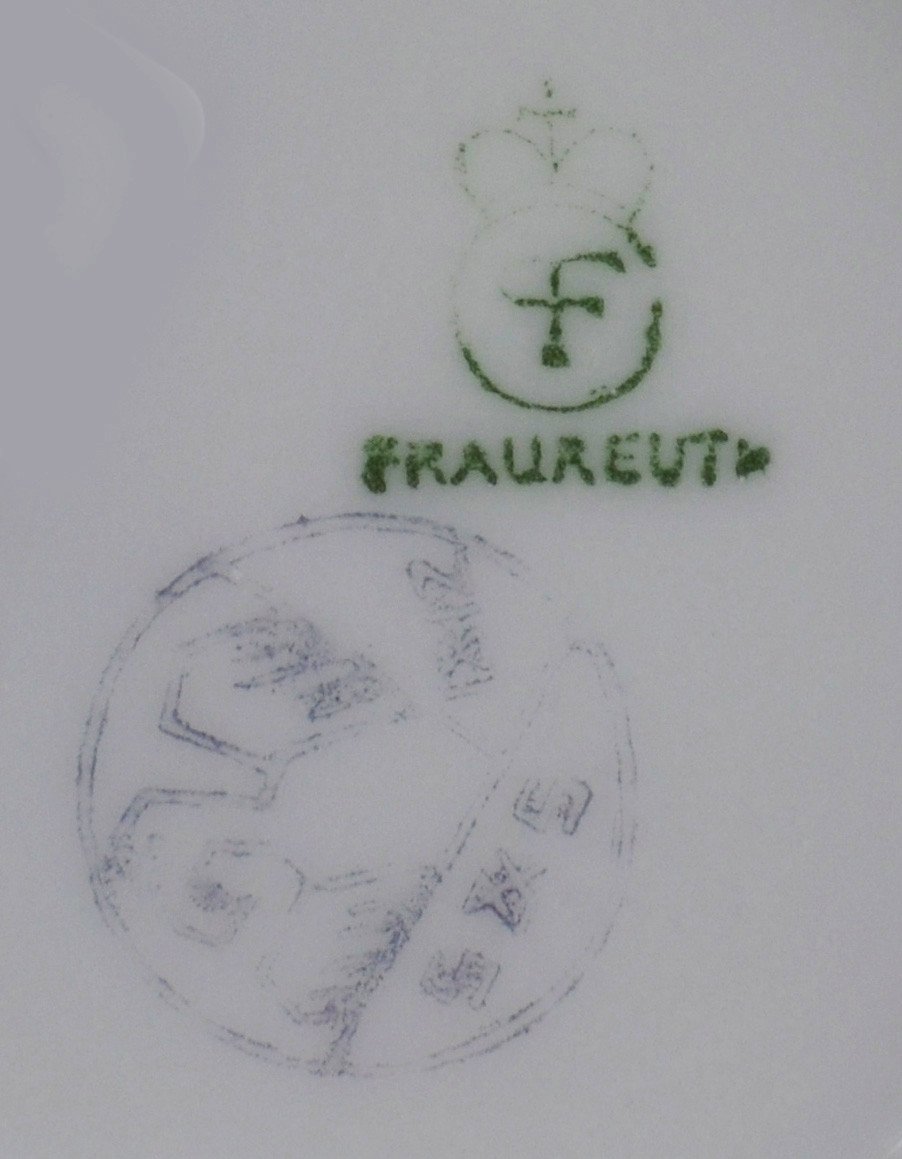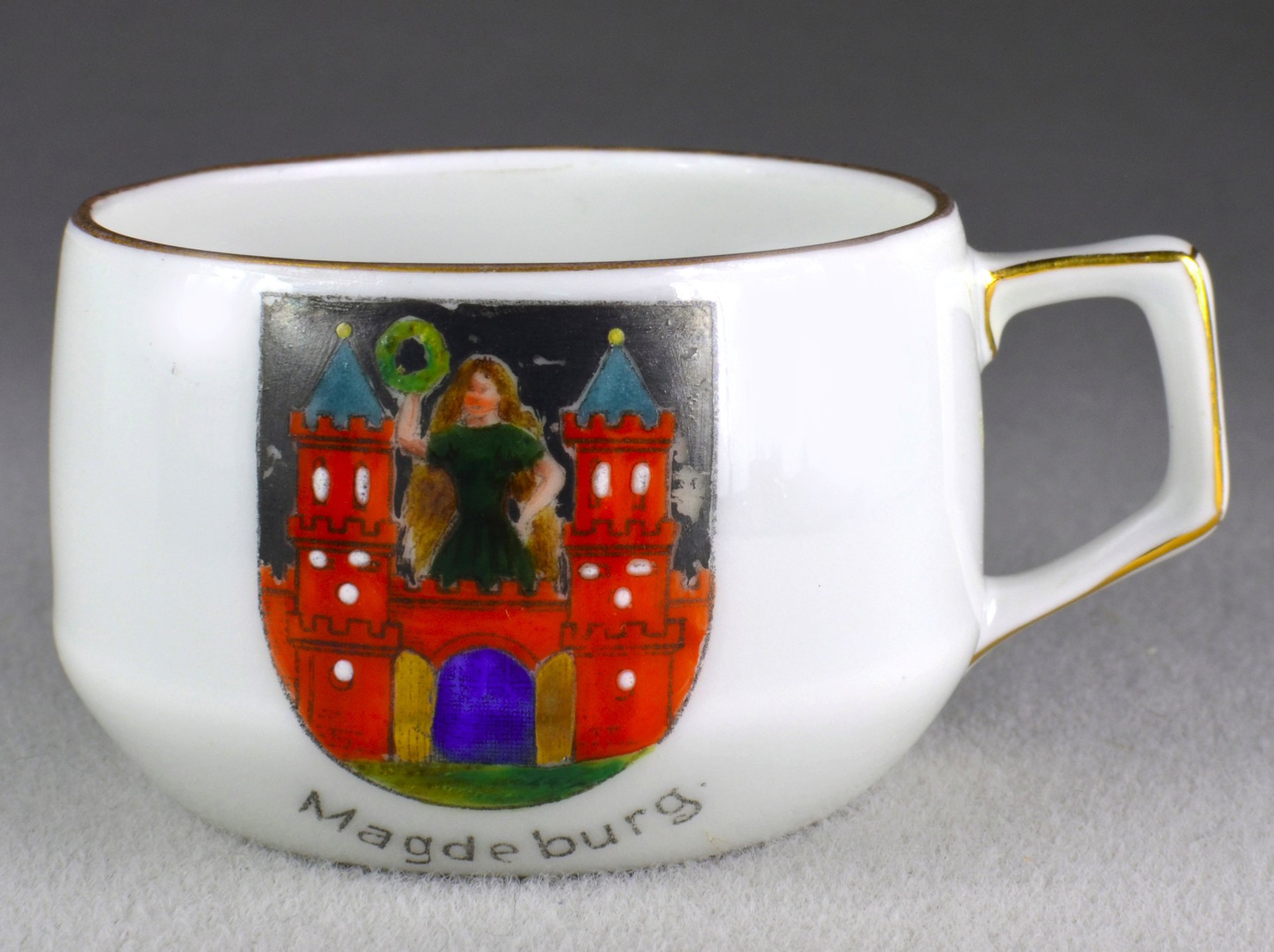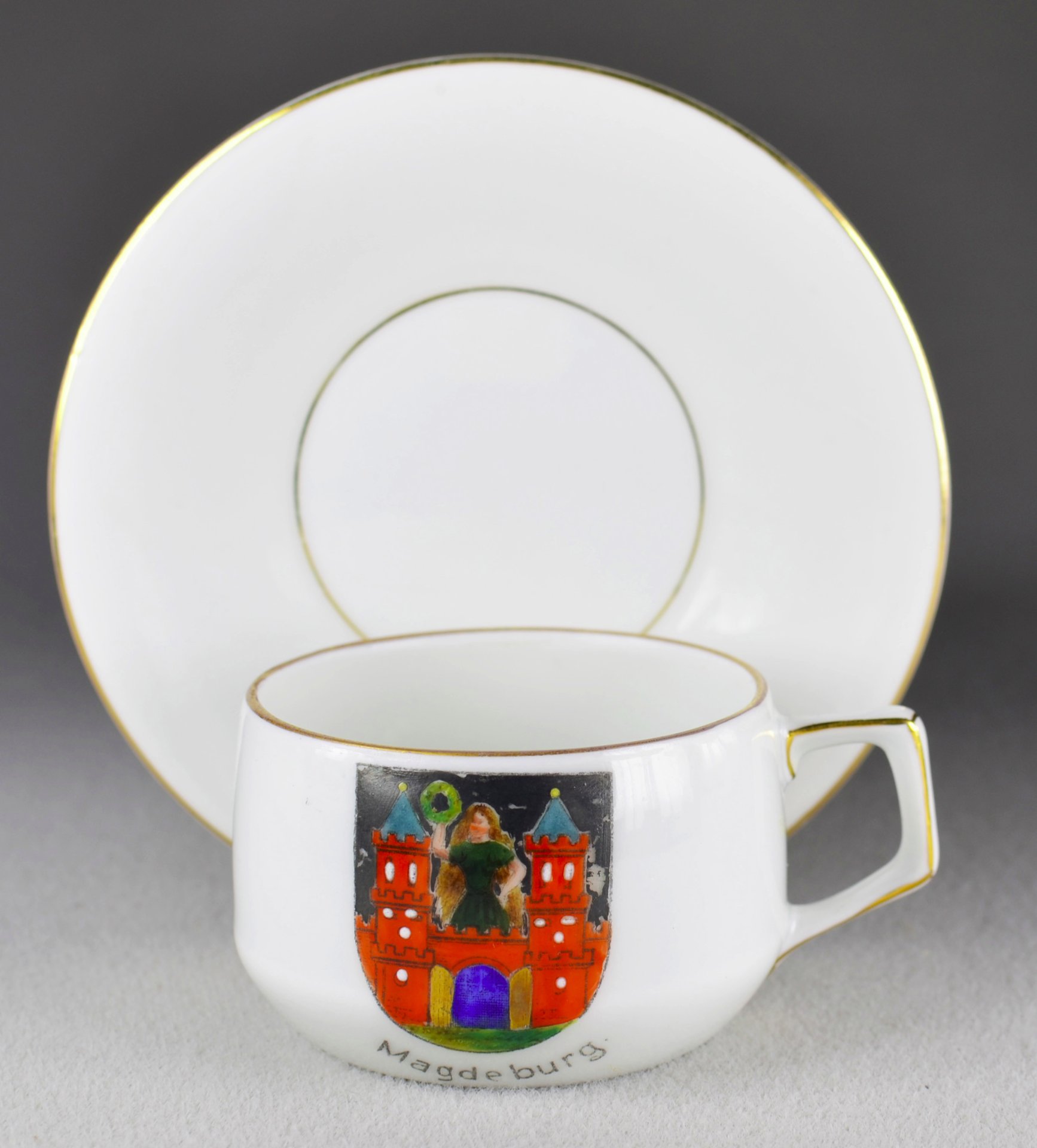 Tasse mit Ansicht des von Hand gemalten Stadtwappens von Magdeburg. Am Boden die unter Glasur grüne Porzellanmarke und zusätzlich auf Glasur in Silber Maler- oder Händlermarke. H.: 3,9 cm; D.: 6,4 cm. Dazu Untertasse, ungemarkt H.: 1,5 cm; 11,0 cm