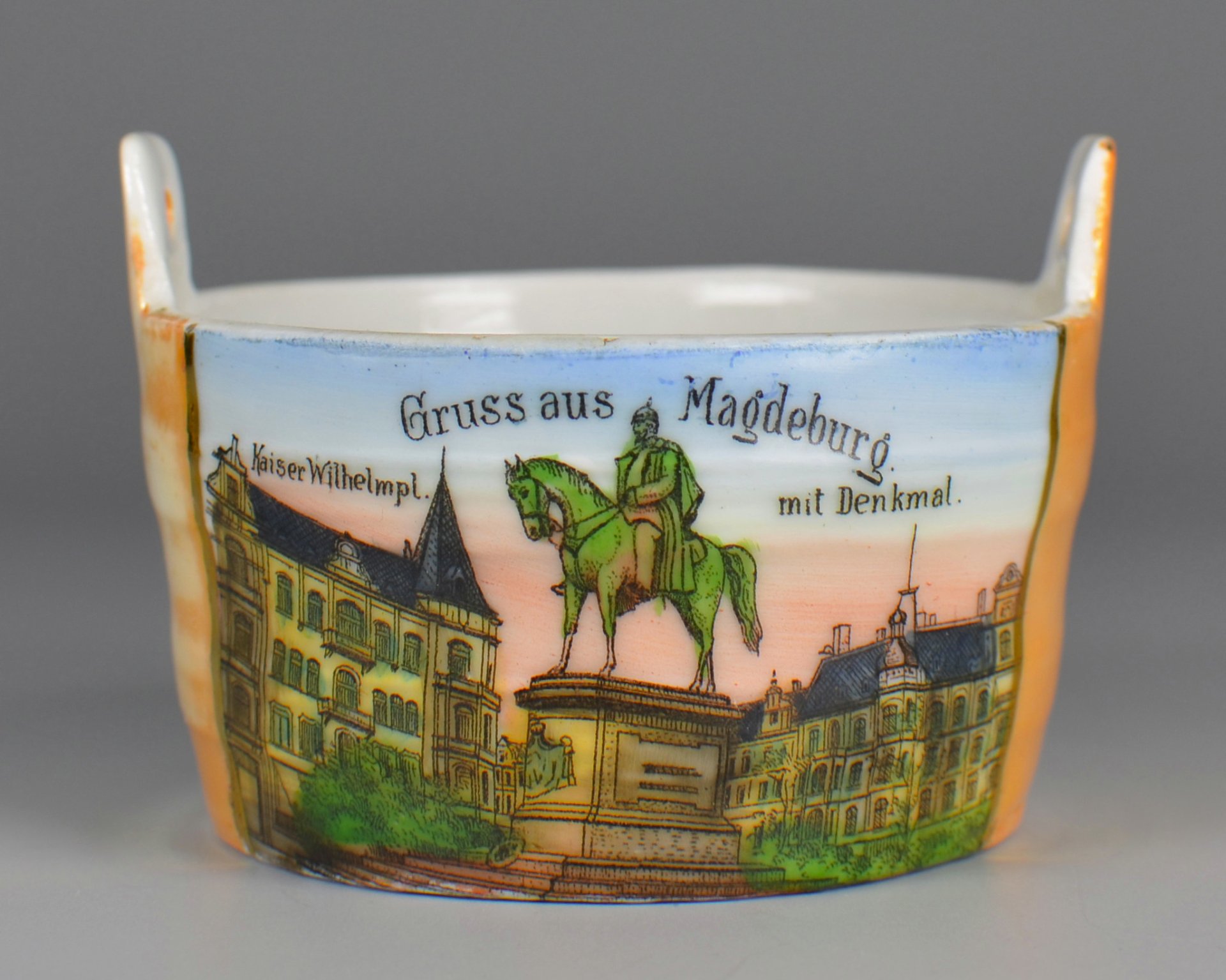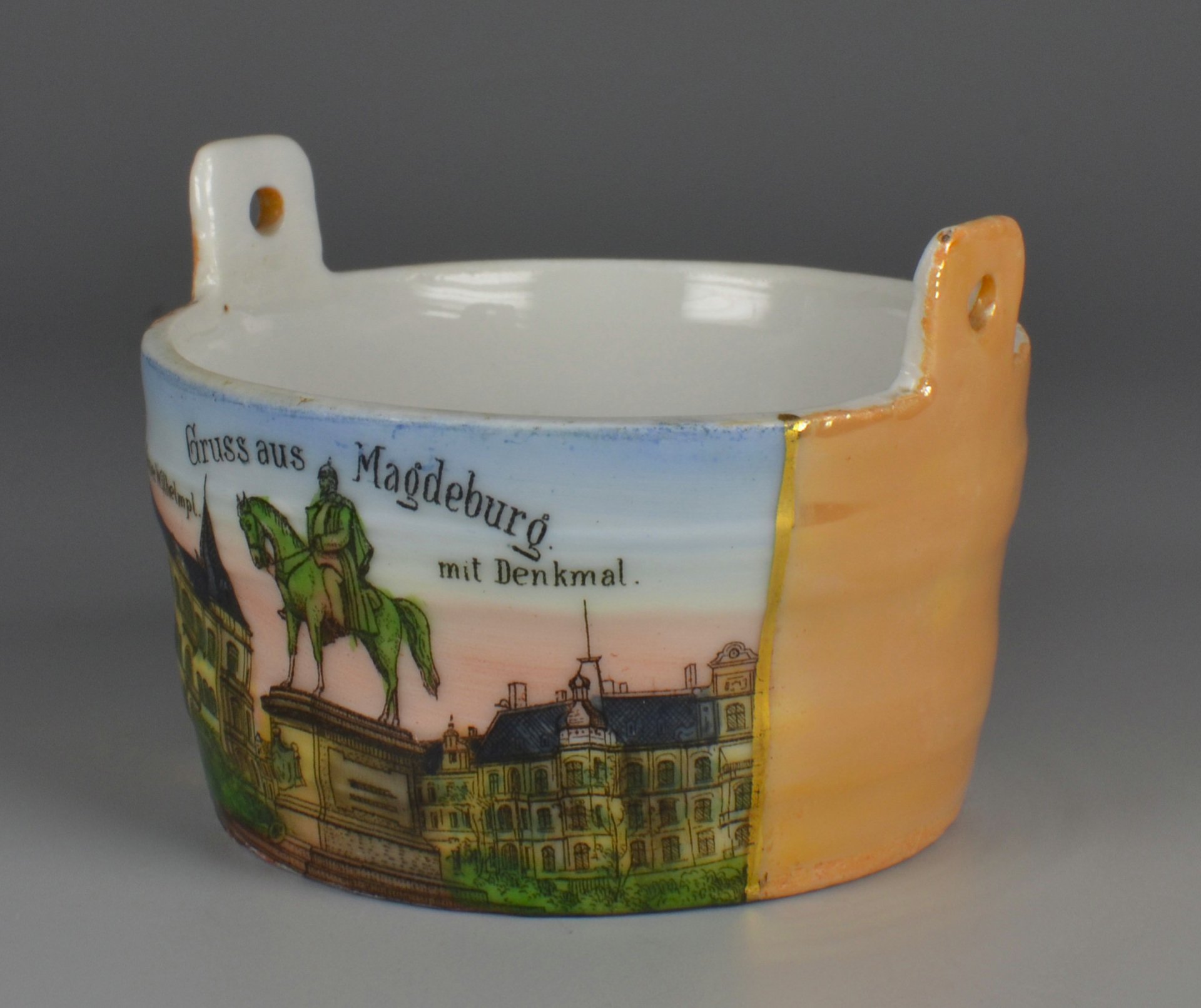 Porzellangefäß um 1900 in Form eines Waschtroges mit Abbildung des Kaiser Wilhelm Platzes und Denkmal, ohne Porzellanmarke; H.: 5,4 cm; D.: 7,7 cm