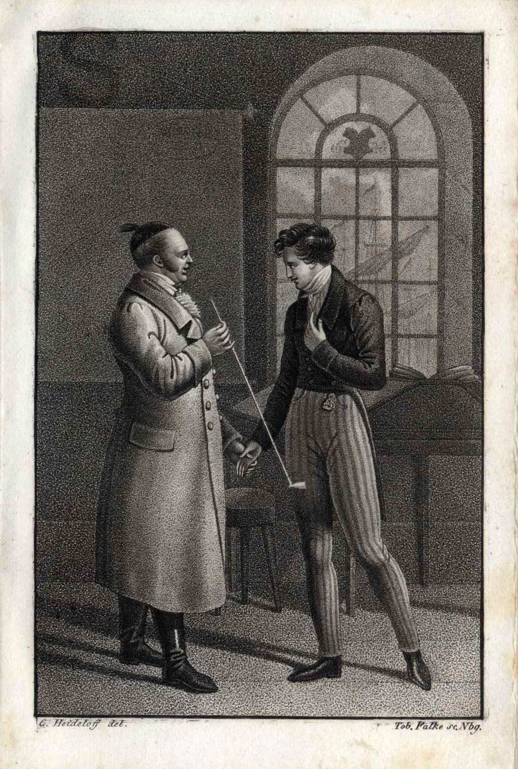 Kupferstich, ohne Titel, nach Johann Friedrich Carl Heideloff (1770-1816), Darstellung zweier Herren im Gespräch, von denen einer eine lange Tonpfeife raucht. Veröffentlicht im „Taschenbuch von der Donau, Auf das Jahr 1825, Herausgegeben von Ludwig Neuhfer, Ulm in der Stettin'schen Buchhandlung.