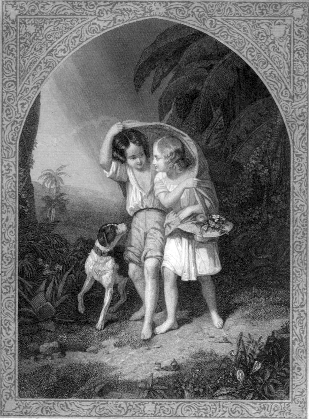 Stahlstich, ohne Bezeichnung, nach dem Gemälde von Joseph Beaume (1796-1885), Paul & Virginie, Szene zu dem Roman von Bernardin de Saint-Pierre (1737-1814), veröffentlicht in „Cornelia“, Taschenbuch für Deutsche Frauen auf das Jahr 1850, von I.W.Appell, 35. Jahrgang Darmstadt, Druck & Verlag v. Gustav Georg Lange