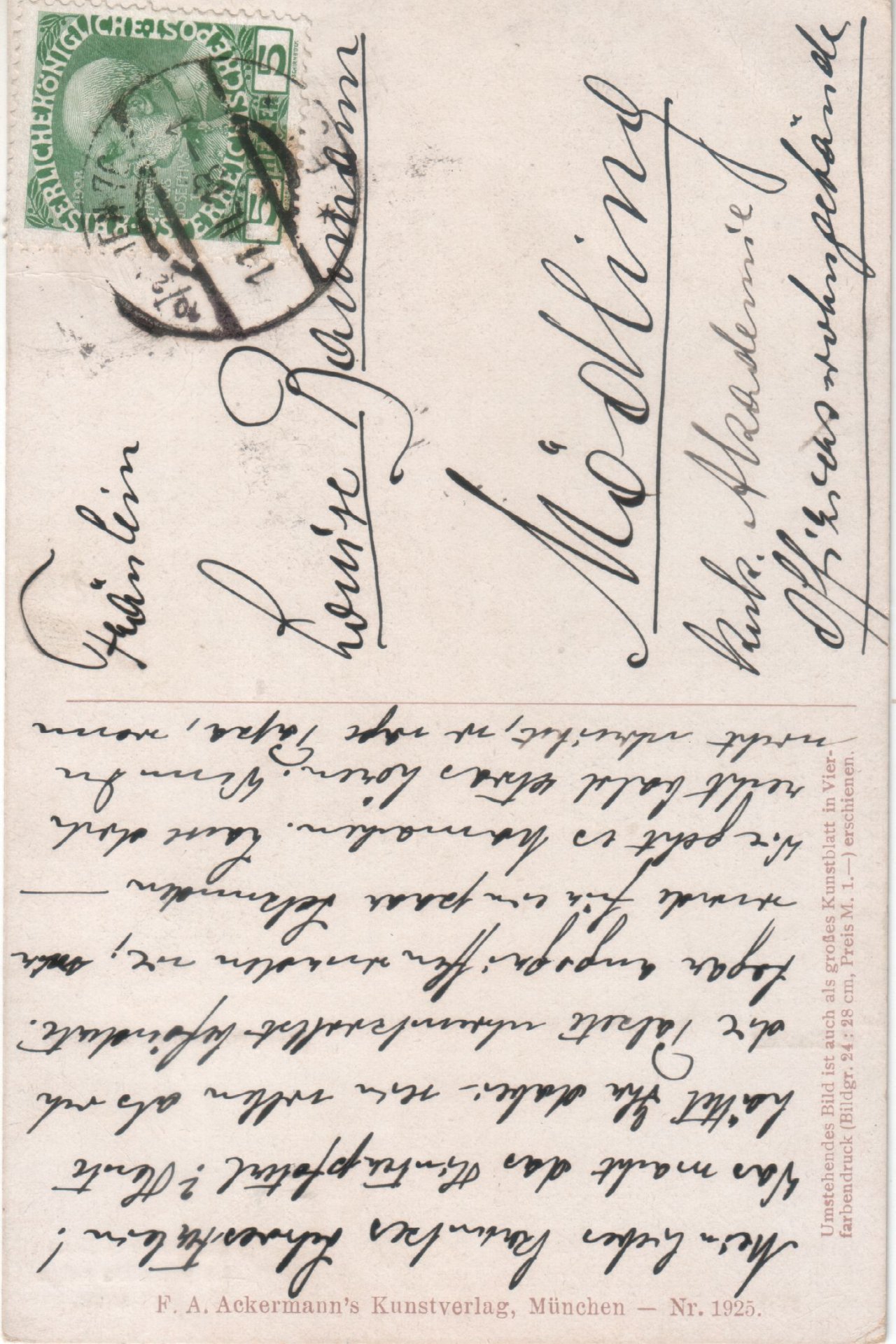 Adressiert an Fräulein Louise Baumann in Mödling. Kuk Akademie Offizierswohngebäude.