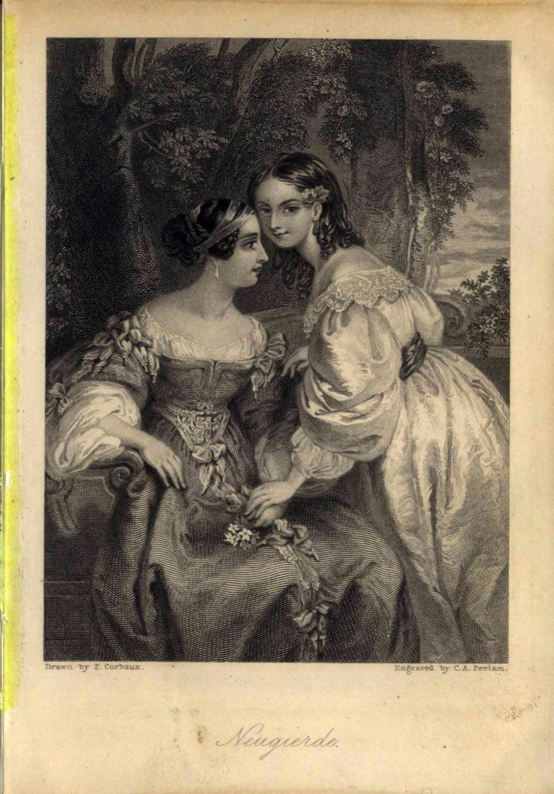 C.A. Periam, Stahlstich, bezeichnet: „Neugierde“, gemalt von Fanny Corbaux (1812-1833), ersschienen im Rheinischen Taschenbuch 1837, herausgegeben von Dr. Adrian, Druck und Verlag von Johann David Sauerländer, Frankfurt am Main.