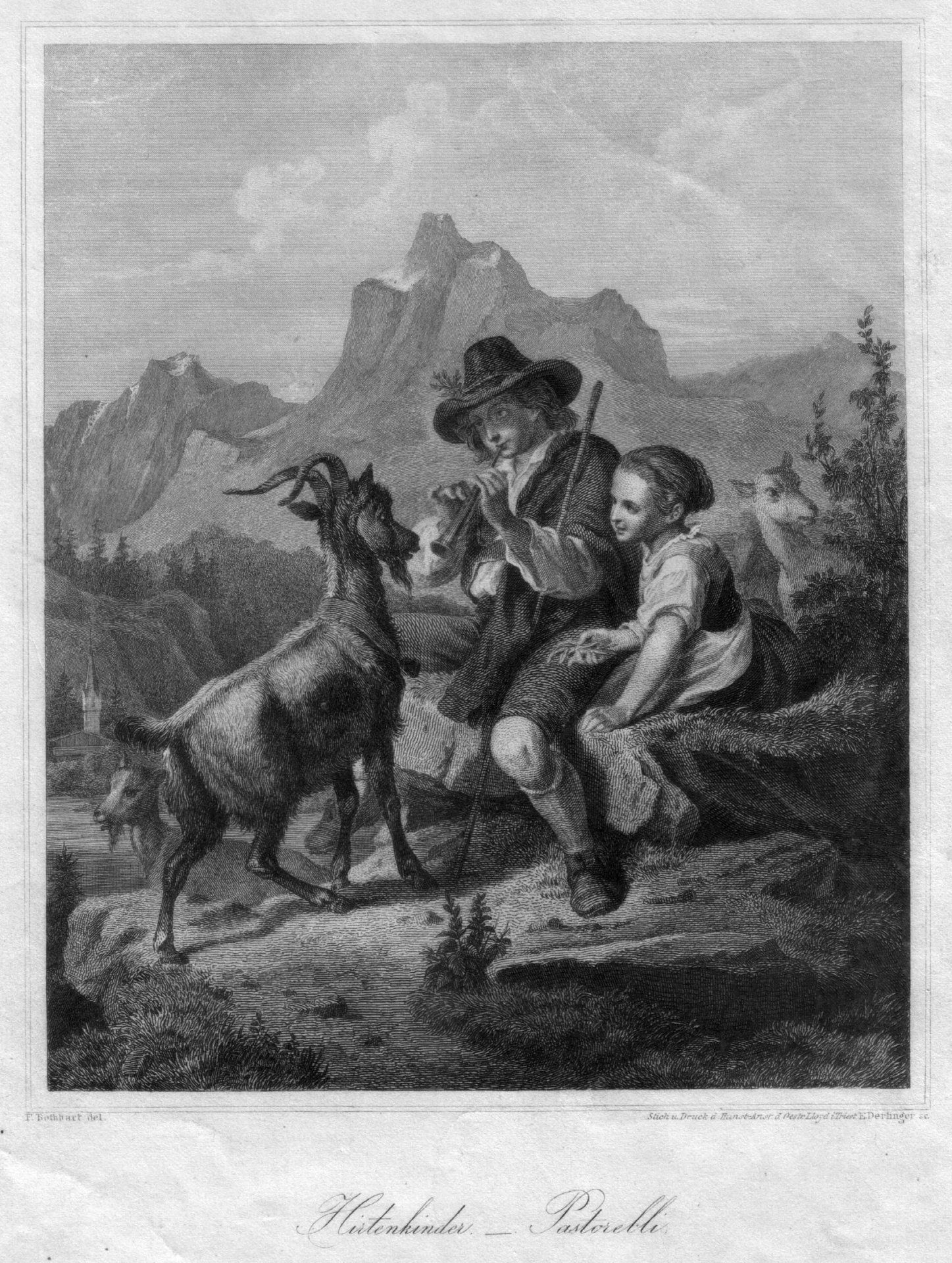 Stahlstich 1856, bezeichnet: „Hirtenkinder – Pastorelli“, nach einem Gemälde von Ferdinand Rothbart (1823-1899), Stich und Druck der Kunst-Anstalt d. Oesterr. Lloyd in Triest; Ein Hirtenknabe bläst einem Ziegenbock etwas auf der Flöte vor, daneben ein Mädchen; Blatt:25,8 x 18,5 cm; Abbildung: 16,9 x 14 cm.