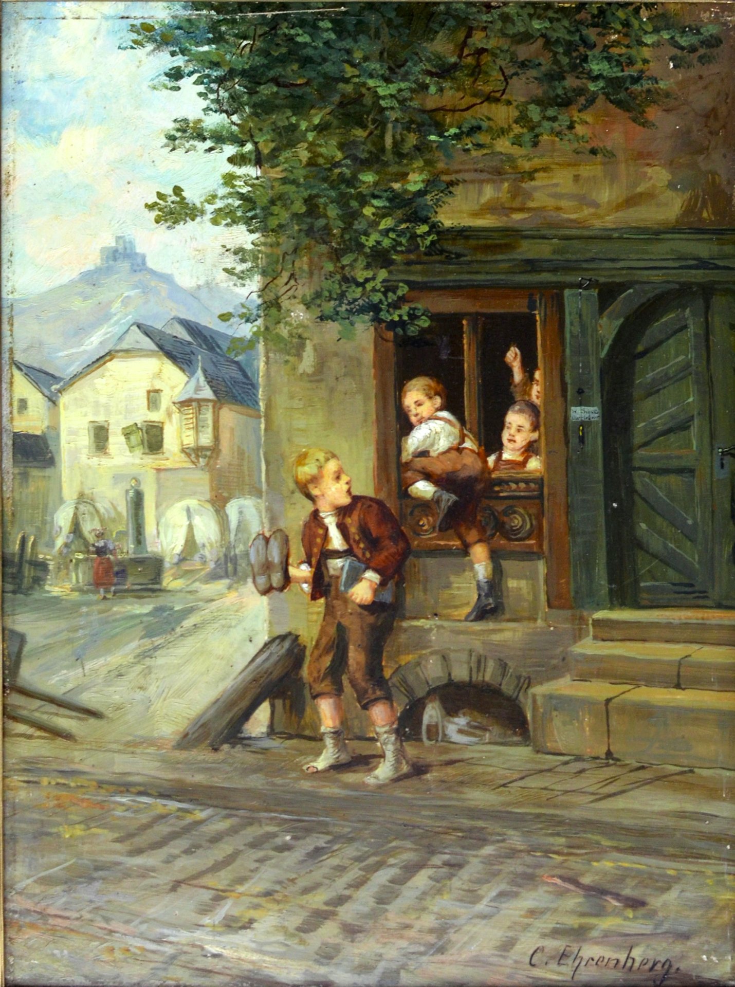 Gemälde, Die Schulschwänzer, Öl/Holz, signiert unten rechts: C. Ehrenberg. Stimmungsvolle Darstellung von Schulkindern, die sich barfuss aus dem Fenster der Grundschule schleichen. Mit vielen Details, wie Löcher in den Strümpfen, dem Namen auf dem Klingelschild „W. Schulte, Oberlehrer“ oder den schief hängenden Fensterläden in dörflicher, bergischer Umgebung erzählt der Maler im Stil der Spätromantik mit teils impressionistischer Malweise eine erheiternde Geschichte von Lausbuben um 1880. Bild: 40 x 31,8 cm; Rahmen ergänzt: 57 x 47 cm