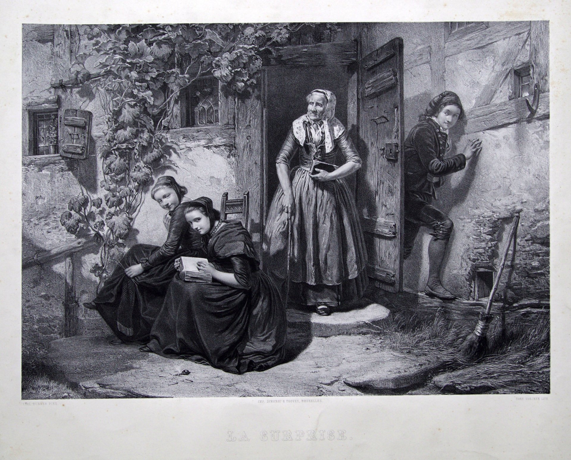 Lithographie, bezeichnet: La Surprise, nach Vorlage von Carl Wilhelm Hübner (1814-1879), gedruckt bei Simonau & Toovey in Brüssel, Blatt: 66,5 x 87,0cm; Abbildung: 43,5 x 63,5cm