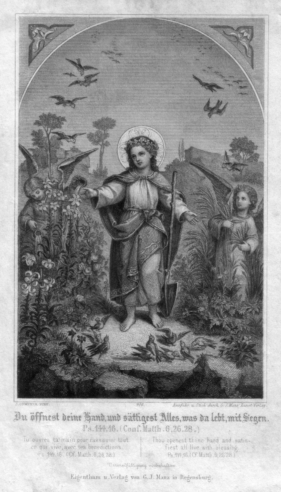 Stahlstich nach Josef Obwexer (1828-1875), Titel: „Du öffnest deine Hand, und sättigest Alles, was da lebt, mit Segen. Ps. 144.16. (Conf. Matth. 6.26.28.)“, Eigentum u. Verlag von G. J. Manz in Regensburg; Blatt: 17,2 x 10,5 cm; Abbildung: 12 x 7,8 cm