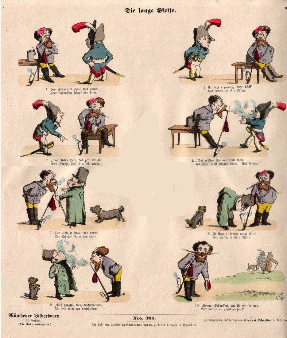 Auszug der Karikatur zur Nutzung der Langpfeifen, von Fritz Steub 1864; Münchener Bilderbogen koloriert, Nr. 384, 11. Auflage, bezeichnet „Die lange Pfeife“, Kgl. Hof- und Universitäts-Buchdruckerei von Dr. C. Wolf & Sohn in München, Herausgegeben und verlegt von Braun & Schneider in München; signiert F. Steub 7/64; Blatt: 42,5 x 33,7cm