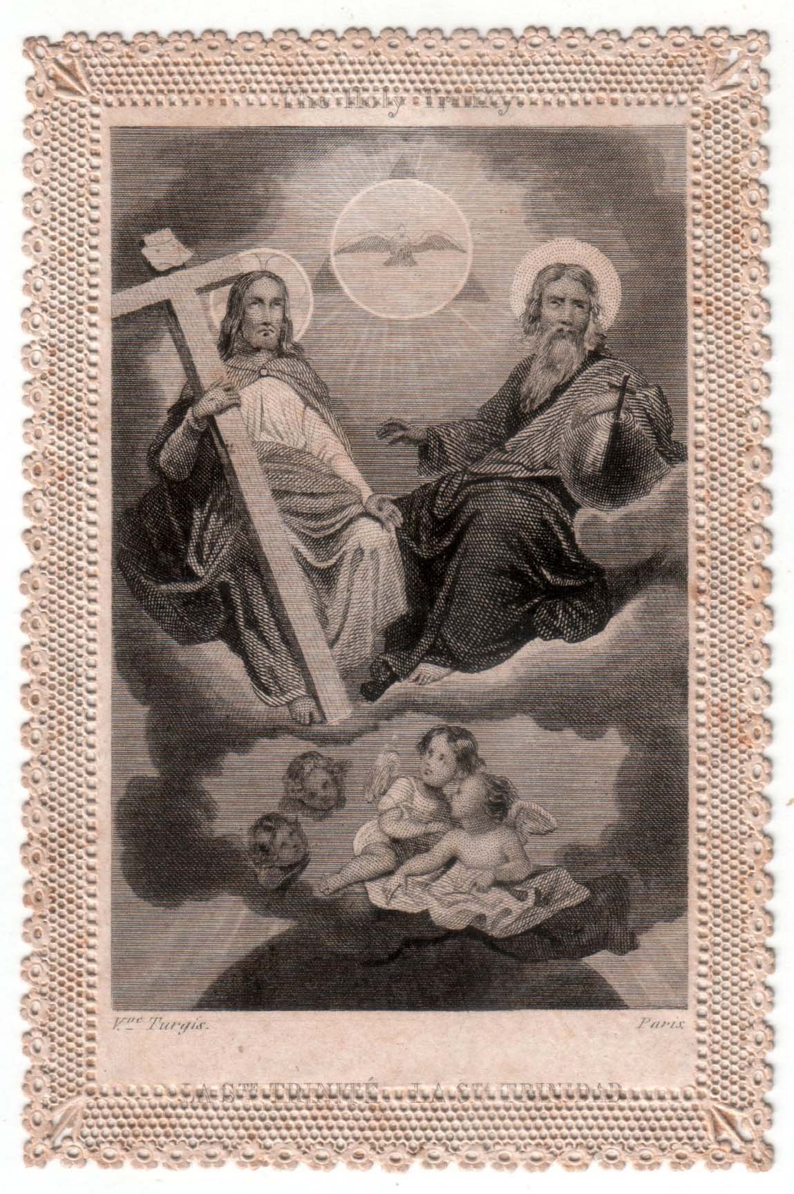 Stahlstich 1856 auf Spitzenpapier bei Turgis, Paris, Heilige Dreifaltigkeit- Vater Sohn und Heiliger Geist, rückseitig mit handschriftlicher Widmung (Bleistift) d. 6.1.56, Blatt: 10,4 x 6,9 cm; Abbildung: 8 x 5,3 cm