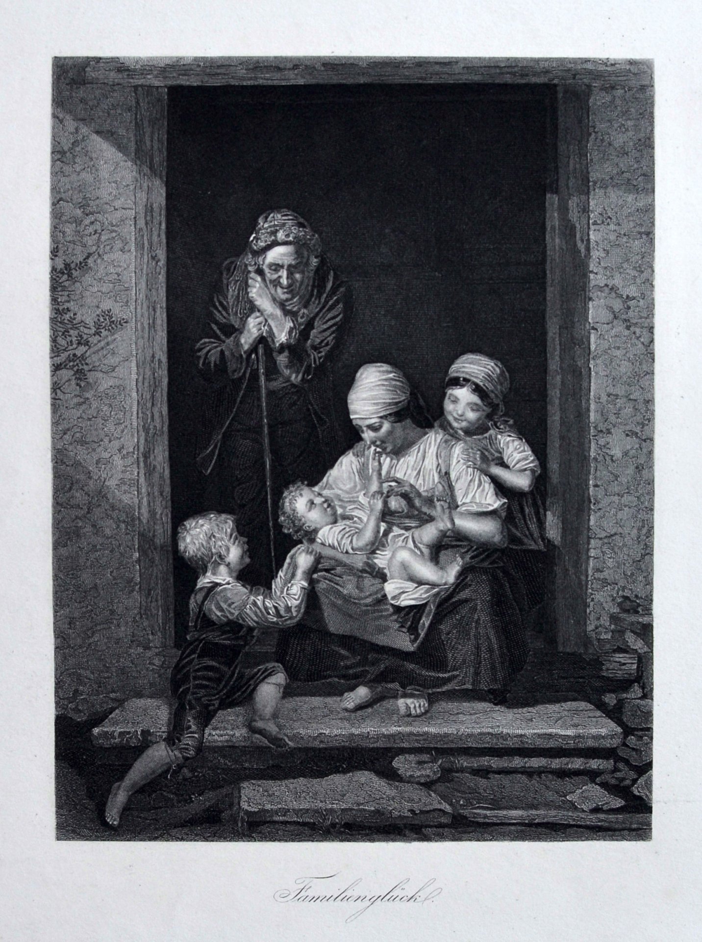 Stahlstich, bezeichnet: „Familienglück“, nach einem Gemälde von Ferdinand Georg Waldmüller (1793-1865). Blatt: 38,5 x 28,3 cm; Ansicht: 18,5 x 14 cm.