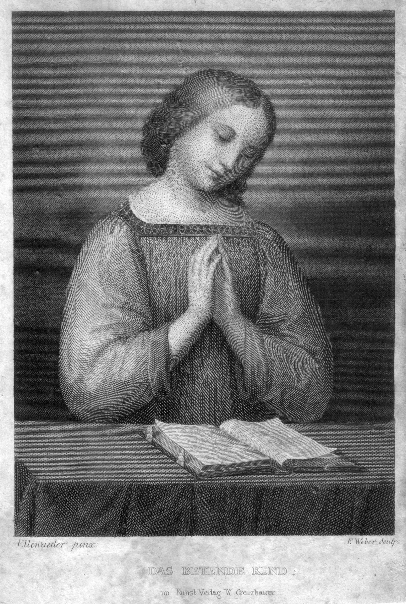 Stahlstich nach Marie Ellenrieder (1791-1863), bezeichnet: „Das betende Kind“, Andachtsbild, „im Kunst-Verlag W. Creuzbauer“; Blatt: 13,3 x 9 cm;  Abbildung: 11,1 x 8,1 cm