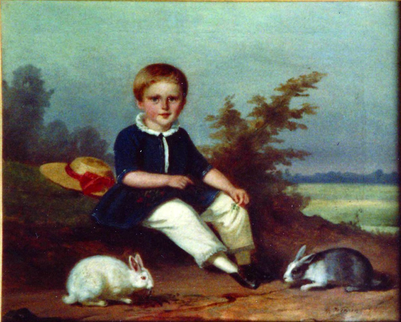 Gemälde, Öl/Lw.; signiert unten rechts: H. Werner 1852, Kinderpartrait des sitzenden und mit Hasen spielenden Paul Kricheldorff (1848-1857)